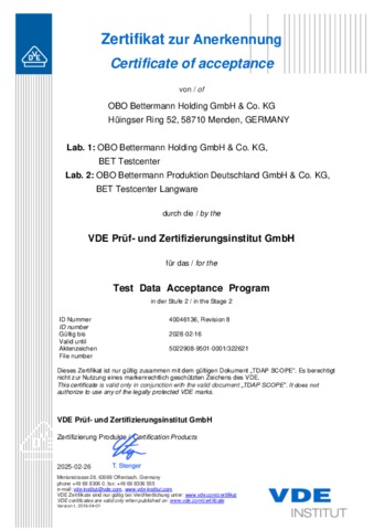 A série de normas DIN / EN / IEC 61643 exige vários testes de desempenho e segurança para verificar a capacidade de descarga e o desempenho correto dos dispositivos de proteção contra sobretensões (DST). Esses testes também garantem a segurança dos DSTs em caso de falhas no sistema.
