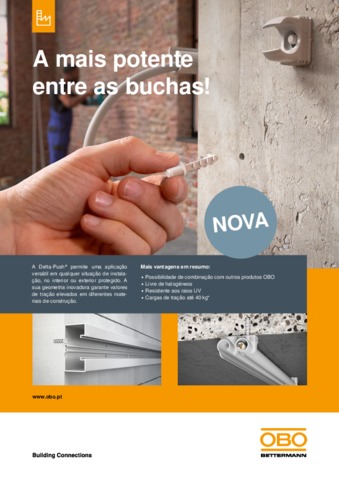 Descubra a nova geração de buchas rápidas em plásticoEstamos a estabelecer novos padrões na tecnologia de encaixe: com a nossa bucha rápida em plástico Delta-Push® da OBO. É fácil de instalar e, ao mesmo tempo, impressiona pelos seus elevados valores de retenção em diferentes bases. Esta bucha rápida da OBO garante uma fixação firme, uma aplicação flexível e é complementada por uma vasta gama de acessórios.