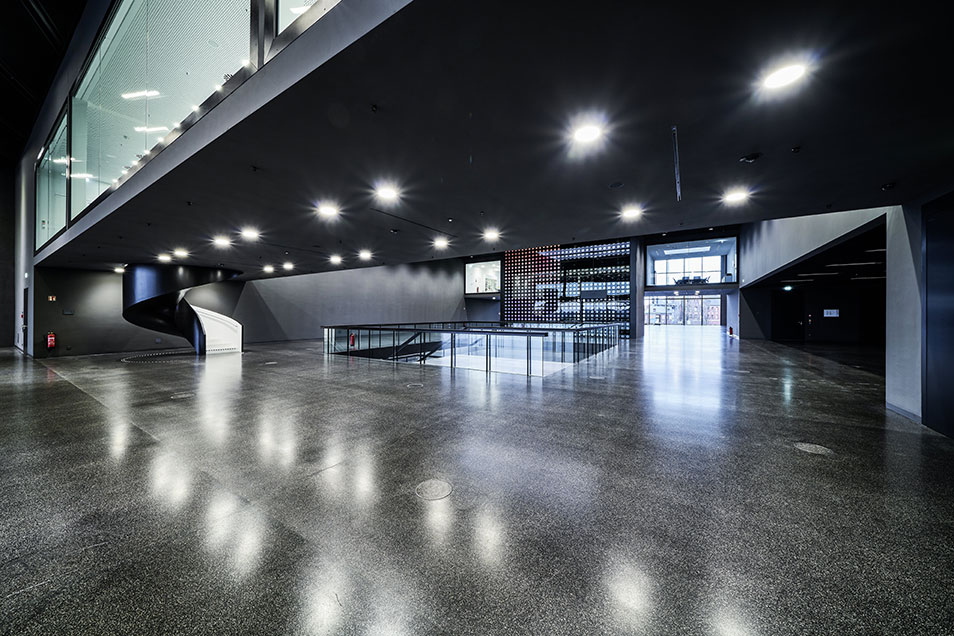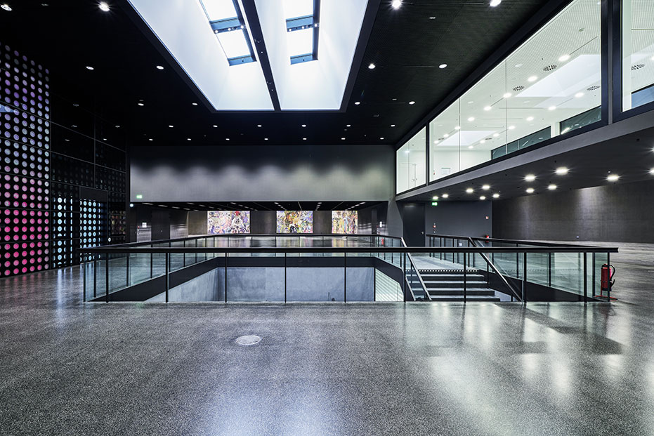Wichtig war bei der gesamten Planung die Flexibilität. Gerade im mittleren Bereich, auf der Veranstaltungsebene, wurde in Szenarien gedacht. Auf jeden Fall wird hier bei so gut wie jeder Veranstaltung mobile Technik benötigt. Das Gleiche gilt für die Ausstellungsfläche im Dachgeschoss. Wechselnde Ausstellungen brauchen flexible Stromversorgungen, in diesem Fall über den Boden.