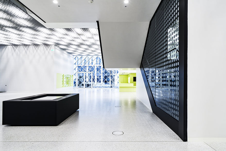 In den polierten Terrazzo-Böden sind robuste Bodensteckdosen von OBO Bettermann mit Bodenbelags-Aussparungen verbaut, die die Bodendecke optisch nahezu unangetastet lassen. Die unscheinbaren Auslässe sind im Innern mit Steckdosen und Datendosen ausgestattet, die für eine Vielzahl von Austellern und ihre mobile Technik genutzt werden kann. Die OBO-Bodensteckdosen werden über die moderne Solaranlage auf dem Dach des Futuriums versorgt.