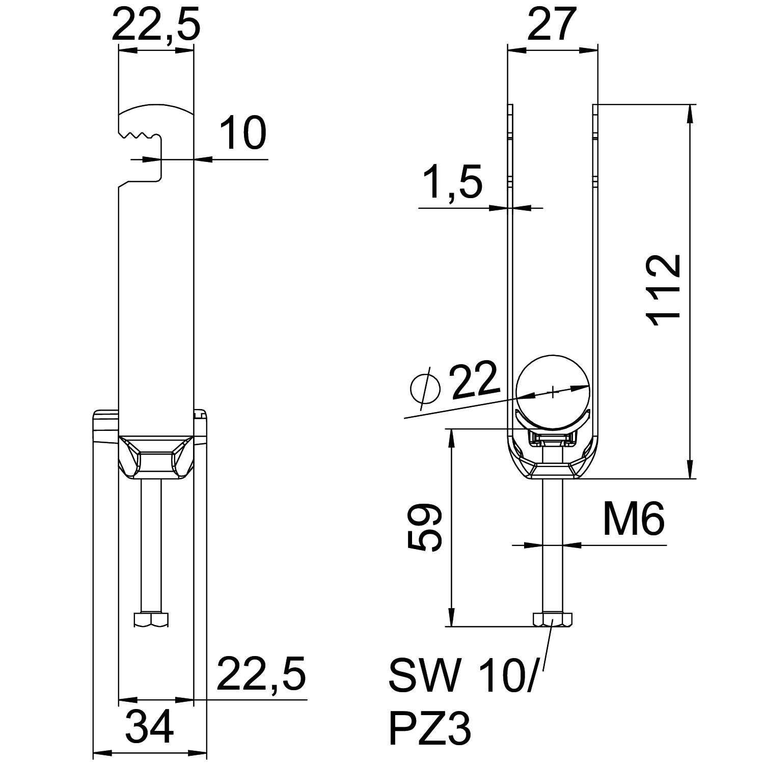 Altura 112 mm Com placa de plástico sim Comprimento 22,5 mm Comprimento exterior 34 mm Dimensão 16-22mm Espessura das chapas 1,5 mm Intervalo de aperto D máx. 22 mm Intervalo de aperto D mín. 16 mm Largura 27 mm Largura de rasgo 10 mm Livre de halogéneos sim Material Aço Material adicional Aço Máx. Binário de aperto 3 Nm Medida A 22,5 mm Medida B 27 mm Medida C 34 mm Medida G (mm) M6 Medida H 112 mm Medida L 59 mm Medida t 1,5 mm Número de cabos/tubos 3 para diâmetro de tubo máx. 22 mm para diâmetro de tubo mín. 16 mm Pegada de CO2 (GWP) do berço ao portão 0,2081 kg CO2e / 1 Peça Rosca M6 Superfície Galvanizado por imersão a quente após maquinação Superfície adicional galvanizado a quente por centrifugação Tipo de montagem perfil plano - Todos os tipos