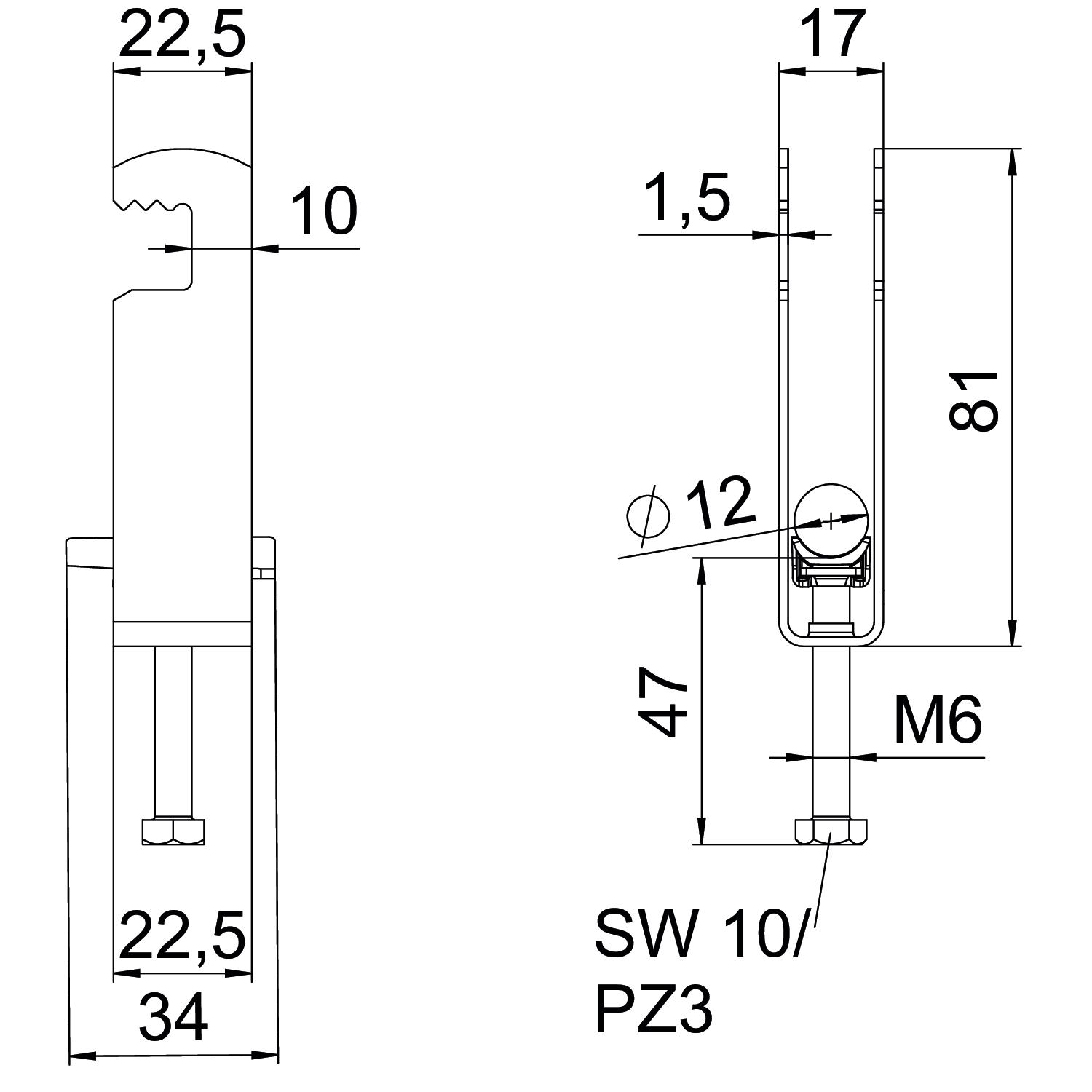 Altura 81 mm Com placa de plástico sim Comprimento 22,5 mm Comprimento exterior 34 mm Dimensão 8-12mm Espessura das chapas 1,5 mm Intervalo de aperto D máx. 12 mm Intervalo de aperto D mín. 8 mm Largura 17 mm Largura de rasgo 10 mm Livre de halogéneos sim Material Aço Material adicional Aço Máx. Binário de aperto 3 Nm Medida A 22,5 mm Medida B 17 mm Medida C 34 mm Medida G (mm) M6 Medida H 81 mm Medida L 47 mm Medida t 1,5 mm Número de cabos/tubos 3 para diâmetro de tubo máx. 12 mm para diâmetro de tubo mín. 8 mm Pegada de CO2 (GWP) do berço ao portão 0,1666 kg CO2e / 1 Peça Rosca M6 Superfície Galvanizado por imersão a quente após maquinação Superfície adicional galvanizado a quente por centrifugação Tipo de montagem perfil plano - Todos os tipos