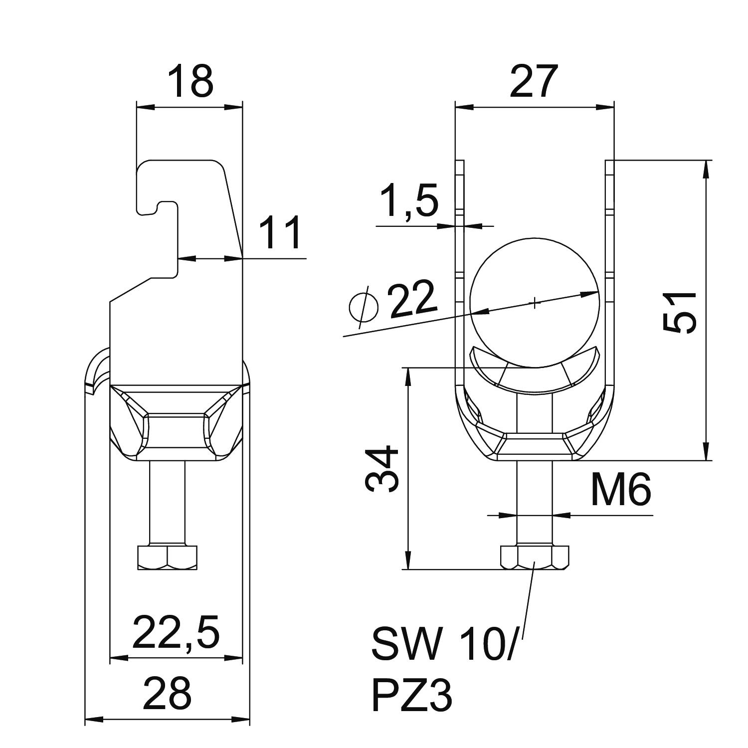 Altura 51 mm Com placa metálica sim Comprimento 22,5 mm Comprimento exterior 28 mm Dimensão 16-22mm Espessura das chapas 1,5 mm Intervalo de aperto D máx. 22 mm Intervalo de aperto D mín. 16 mm Largura 27 mm Largura de rasgo 10 mm Livre de halogéneos sim Material Aço inoxidável, livre de ferrugem 1.4301 Material adicional aço inoxidável Máx. Binário de aperto 3 Nm Medida A 22,5 mm Medida B 27 mm Medida C 28 mm Medida G (mm) M6 Medida H 51 mm Medida L 34 mm Medida t 1,5 mm Número de cabos/tubos 1 para diâmetro de tubo máx. 22 mm para diâmetro de tubo mín. 16 mm para perfil com rasgo (com intervalo) máx. 22 mm para perfil com rasgo (com intervalo) mín. 18 mm Pegada de CO2 (GWP) do berço ao portão 0,2807 kg CO2e / 1 Peça Rosca M6 Superfície brilhante, pós-tratamento Superfície adicional sem tratamento Tipo de montagem Perfil - Todos os tipos