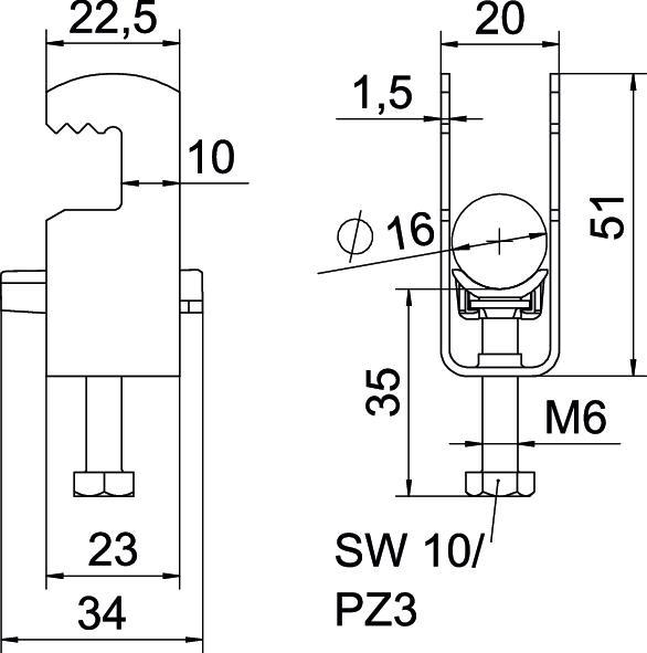 Altura 51 mm Com contraplaca não Com placa de plástico sim Comprimento 22,5 mm Comprimento exterior 34 mm Dimensão 12-16mm Espessura das chapas 1,5 mm Intervalo de aperto D máx. 16 mm Intervalo de aperto D mín. 12 mm Largura 20 mm Largura de rasgo 10 mm Livre de halogéneos sim Material Aço Material adicional Aço Material da cuba Plástico Máx. Binário de aperto 3 Nm Medida A 22,5 mm Medida B 20 mm Medida C 34 mm Medida G (mm) M6 Medida H 51 mm Medida L 35 mm Medida t 1,5 mm Número de cabos/tubos 1 para diâmetro de tubo máx. 16 mm para diâmetro de tubo mín. 12 mm Pegada de CO2 (GWP) do berço ao portão 0,0898 kg CO2e / 1 Peça Qualidade do material da cuba Polipropileno Rosca M6 Superfície Galvanizado por imersão a quente após maquinação Superfície adicional galvanizado a quente por centrifugação Tipo de montagem perfil plano - Todos os tipos