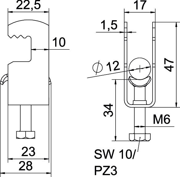 Altura 47 mm Com contraplaca não Com placa metálica sim Comprimento 22,5 mm Comprimento exterior 28 mm Dimensão 08-12mm Espessura das chapas 1,5 mm Intervalo de aperto D máx. 12 mm Intervalo de aperto D mín. 8 mm Largura 17 mm Largura de rasgo 10 mm Livre de halogéneos sim Material Aço Material adicional Aço Material da cuba Aço Máx. Binário de aperto 3 Nm Medida A 22,5 mm Medida B 17 mm Medida C 28 mm Medida G (mm) M6 Medida H 47 mm Medida L 34 mm Medida t 1,5 mm Número de cabos/tubos 1 para diâmetro de tubo máx. 12 mm para diâmetro de tubo mín. 8 mm Pegada de CO2 (GWP) do berço ao portão 0,0941 kg CO2e / 1 Peça Rosca M6 Superfície Galvanizado por imersão a quente após maquinação Superfície adicional galvanizado a quente por centrifugação Tipo de montagem perfil plano - Todos os tipos