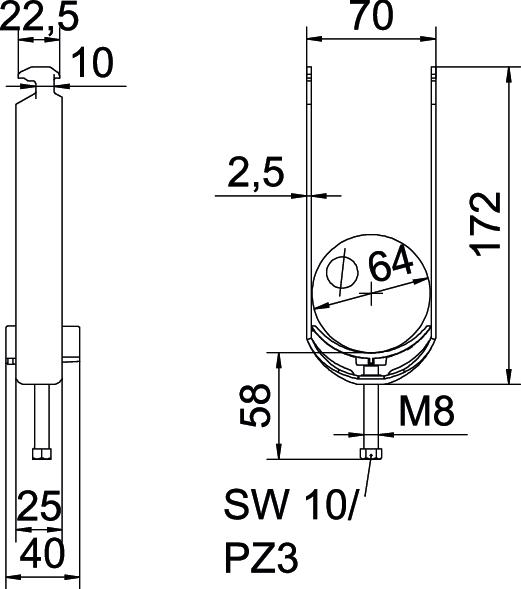 Altura 172 mm Com contraplaca não Com placa de plástico sim Comprimento 25 mm Comprimento exterior 40 mm Dimensão 58-64mm Espessura das chapas 2,5 mm Intervalo de aperto D máx. 64 mm Intervalo de aperto D mín. 58 mm Largura 70 mm Largura de rasgo 10 mm Livre de halogéneos sim Material Aço Material adicional Aço Material da cuba Plástico Máx. Binário de aperto 5 Nm Medida A 25 mm Medida B 70 mm Medida C 40 mm Medida G (mm) M8 Medida H 172 mm Medida L 58 mm Medida t 2,5 mm Número de cabos/tubos 2 para diâmetro de tubo máx. 64 mm para diâmetro de tubo mín. 58 mm para perfil com rasgo (com intervalo) máx. 17 mm para perfil com rasgo (com intervalo) mín. 16 mm Pegada de CO2 (GWP) do berço ao portão 0,4673 kg CO2e / 1 Peça Qualidade do material da cuba Polipropileno Rosca M8 Superfície Galvanizado por imersão a quente após maquinação Superfície adicional galvanizado a quente por centrifugação Tipo de montagem Perfil - Todos os tipos