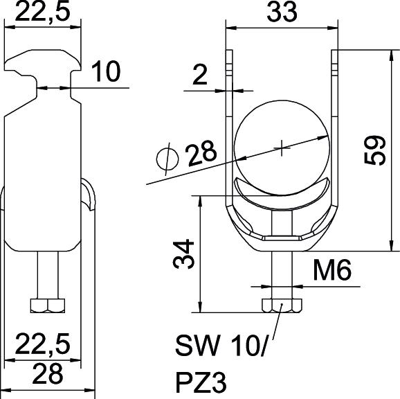 Altura 59 mm Com contraplaca não Com placa de plástico não Com placa metálica sim Comprimento 22,5 mm Comprimento exterior 28 mm Dimensão 22-28mm Espessura das chapas 2 mm Funktionsgaranti sim Intervalo de aperto D máx. 28 mm Intervalo de aperto D mín. 22 mm Largura 33 mm Largura de rasgo 10 mm Livre de halogéneos sim Material Aço Material adicional Aço Material da cuba Aço Máx. Binário de aperto 3 Nm Medida A 22,5 mm Medida B 33 mm Medida C 28 mm Medida G (mm) M6 Medida H 59 mm Medida L 34 mm Medida t 2 mm Número de cabos/tubos 1 para diâmetro de tubo máx. 28 mm para diâmetro de tubo mín. 22 mm para perfil com rasgo (com intervalo) máx. 17 mm para perfil com rasgo (com intervalo) mín. 16 mm Pegada de CO2 (GWP) do berço ao portão 0,1492 kg CO2e / 1 Peça Rosca M6 Superfície Galvanizado por imersão a quente após maquinação Superfície adicional galvanizado a quente por centrifugação Tipo de montagem Perfil - Todos os tipos