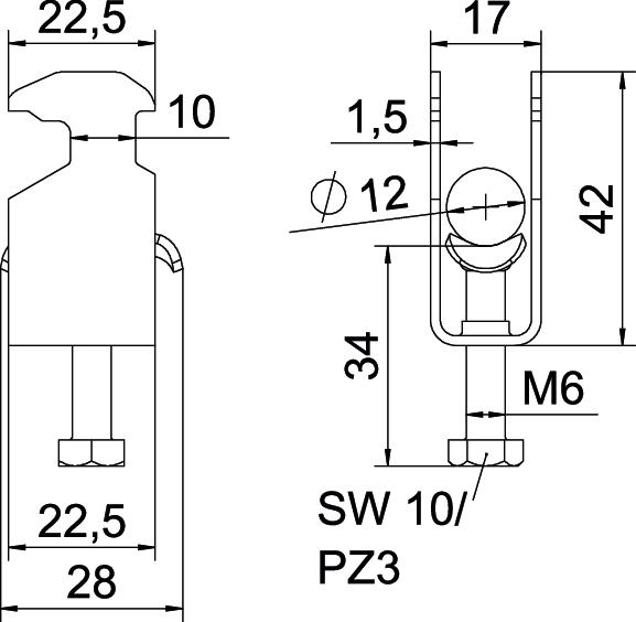 Altura 42 mm Com contraplaca não Com placa de plástico não Com placa metálica sim Comprimento 22,5 mm Comprimento exterior 28 mm Dimensão 08-12mm Espessura das chapas 1,5 mm Funktionsgaranti sim Intervalo de aperto D máx. 12 mm Intervalo de aperto D mín. 8 mm Largura 17 mm Largura de rasgo 10 mm Livre de halogéneos sim Material Aço Material adicional Aço Material da cuba Aço Máx. Binário de aperto 3 Nm Medida A 22,5 mm Medida B 17 mm Medida C 28 mm Medida G (mm) M6 Medida H 42 mm Medida L 34 mm Medida t 1,5 mm Número de cabos/tubos 1 para diâmetro de tubo máx. 12 mm para diâmetro de tubo mín. 8 mm para perfil com rasgo (com intervalo) máx. 17 mm para perfil com rasgo (com intervalo) mín. 16 mm Pegada de CO2 (GWP) do berço ao portão 0,0877 kg CO2e / 1 Peça Rosca M6 Superfície Galvanizado por imersão a quente após maquinação Superfície adicional galvanizado a quente por centrifugação Tipo de montagem Perfil - Todos os tipos