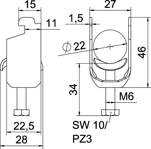 Altura 46 mm Com contraplaca não Com placa metálica sim Comprimento 22,5 mm Comprimento exterior 28 mm Dimensão 16-22mm Espessura das chapas 1,5 mm Intervalo de aperto D máx. 22 mm Intervalo de aperto D mín. 16 mm Largura 27 mm Largura de rasgo 10 mm Livre de halogéneos sim Material Aço Material adicional Aço Material da cuba Aço Máx. Binário de aperto 3 Nm Medida A 22,5 mm Medida B 27 mm Medida C 28 mm Medida G (mm) M6 Medida H 46 mm Medida L 34 mm Medida t 1,5 mm Número de cabos/tubos 1 para diâmetro de tubo máx. 22 mm para diâmetro de tubo mín. 16 mm para perfil com rasgo (com intervalo) máx. 12 mm para perfil com rasgo (com intervalo) mín. 11 mm Pegada de CO2 (GWP) do berço ao portão 0,1008 kg CO2e / 1 Peça Rosca M6 Superfície Galvanizado por imersão a quente após maquinação Superfície adicional galvanizado a quente por centrifugação Tipo de montagem Perfil - Todos os tipos
