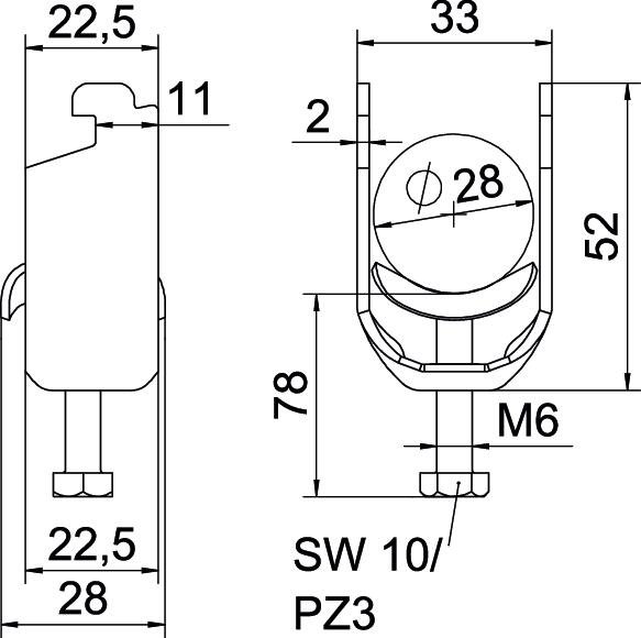Altura 52 mm Com contraplaca não Com placa metálica sim Comprimento 22,5 mm Comprimento exterior 28 mm Dimensão 22-28mm Espessura das chapas 2 mm Intervalo de aperto D máx. 28 mm Intervalo de aperto D mín. 22 mm Largura 33 mm Largura de rasgo 10 mm Livre de halogéneos sim Material Aço Material adicional Aço Material da cuba Aço Máx. Binário de aperto 3 Nm Medida A 22,5 mm Medida B 33 mm Medida C 28 mm Medida G (mm) M6 Medida H 52 mm Medida L 34 mm Medida t 2 mm Número de cabos/tubos 1 para diâmetro de tubo máx. 28 mm para diâmetro de tubo mín. 22 mm para perfil com rasgo (com intervalo) máx. 12 mm para perfil com rasgo (com intervalo) mín. 11 mm Pegada de CO2 (GWP) do berço ao portão 0,1425 kg CO2e / 1 Peça Rosca M6 Superfície Galvanizado por imersão a quente após maquinação Superfície adicional galvanizado a quente por centrifugação Tipo de montagem Perfil - Todos os tipos
