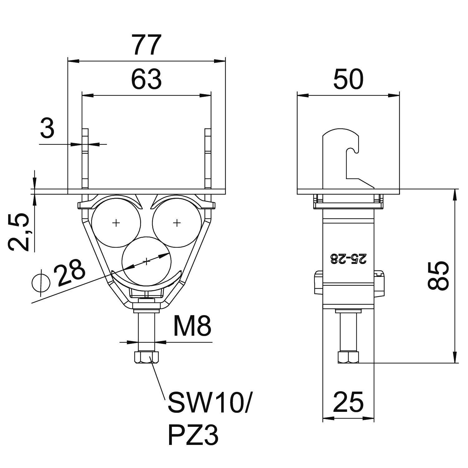 Com contraplaca sim Com placa de plástico sim Com placa metálica não Diâmetro de cabo máx. 28 mm Diâmetro de cabo mín. 25 mm Dimensão 25-28mm Intervalo de aperto D máx. 28 mm Intervalo de aperto D mín. 25 mm Livre de halogéneos sim Material Aço Material adicional Aço Material da contraplaca Plástico Material da cuba Plástico Máx. Binário de aperto 5 Nm Medida A 77 mm Medida B 63 mm Medida H 101 mm Número de cabos/tubos 3 para perfil com rasgo (com intervalo) máx. 22 mm para perfil com rasgo (com intervalo) mín. 18 mm Pegada de CO2 (GWP) do berço ao portão 0,5142 kg CO2e / 1 Peça Qualidade do material da cuba Polipropileno Resistente não Superfície Galvanizado por imersão a quente após maquinação Superfície adicional galvanizado a quente por centrifugação Tipo de montagem Perfil - Todos os tipos