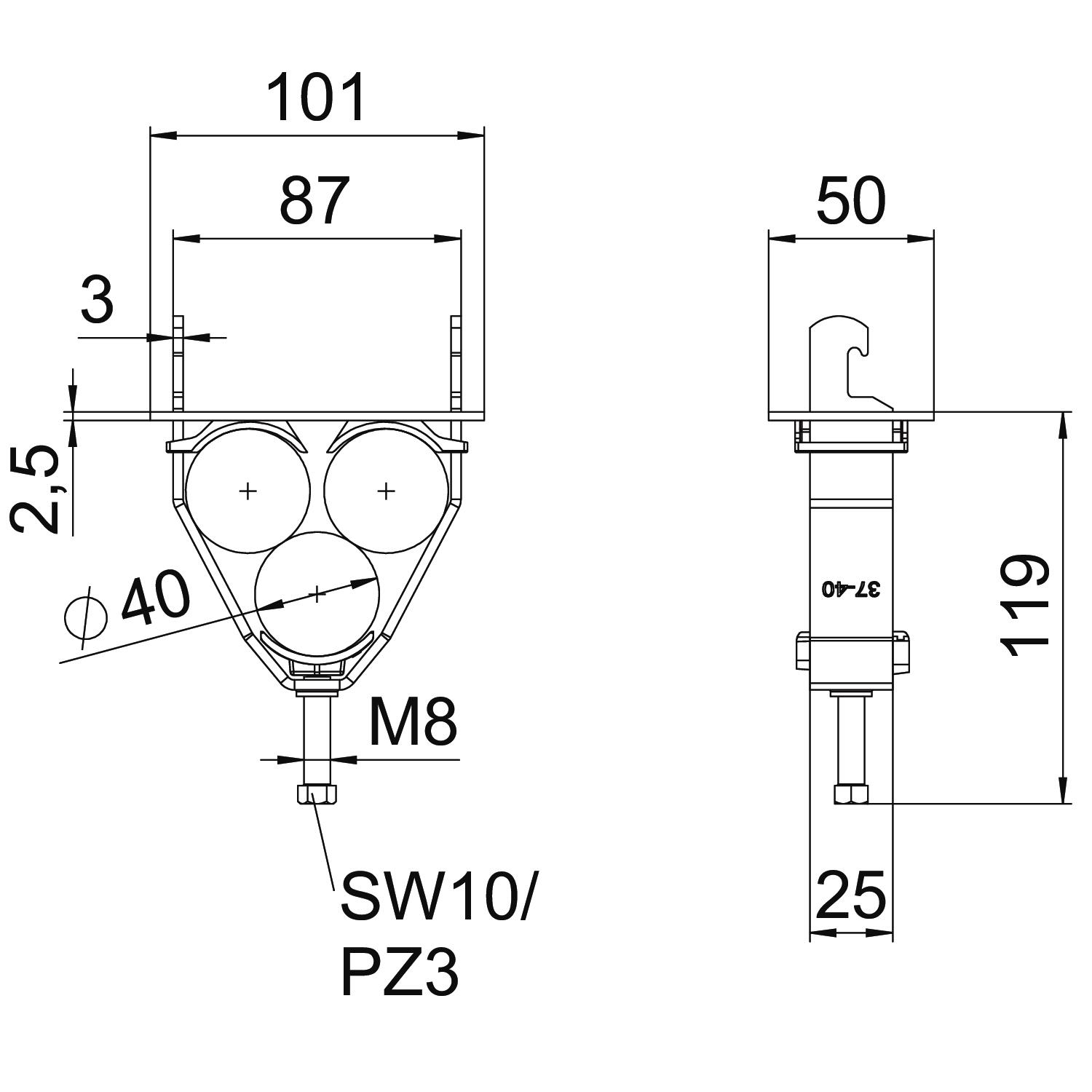 Com contraplaca sim Com placa de plástico sim Com placa metálica não Diâmetro de cabo máx. 40 mm Diâmetro de cabo mín. 37 mm Dimensão 37-40mm Intervalo de aperto D máx. 40 mm Intervalo de aperto D mín. 37 mm Livre de halogéneos sim Material Aço Material adicional Aço Material da contraplaca Plástico Material da cuba Plástico Máx. Binário de aperto 5 Nm Medida A 101 mm Medida B 87 mm Medida H 123 mm Número de cabos/tubos 3 para perfil com rasgo (com intervalo) máx. 22 mm para perfil com rasgo (com intervalo) mín. 18 mm Pegada de CO2 (GWP) do berço ao portão 0,6662 kg CO2e / 1 Peça Qualidade do material da cuba Polipropileno Resistente não Superfície Galvanizado por imersão a quente após maquinação Superfície adicional galvanizado a quente por centrifugação Tipo de montagem Perfil - Todos os tipos