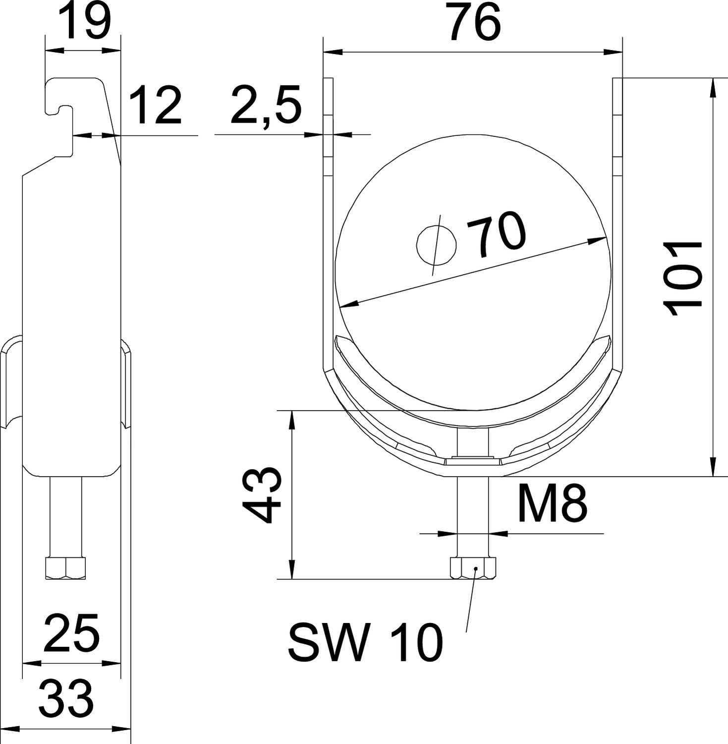 Altura 101 mm Com contraplaca não Com placa metálica sim Comprimento 25 mm Comprimento exterior 33 mm Dimensão 64-70mm Espessura das chapas 2,5 mm Funktionsgaranti sim Intervalo de aperto D máx. 70 mm Intervalo de aperto D mín. 64 mm Largura 76 mm Largura de rasgo 10 mm Livre de halogéneos sim Material Aço Material adicional Aço Material da cuba Aço Máx. Binário de aperto 5 Nm Medida A 25 mm Medida B 76 mm Medida C 33 mm Medida G (mm) M8 Medida H 101 mm Medida L 43 mm Medida t 2,5 mm Número de cabos/tubos 1 para diâmetro de tubo máx. 70 mm para diâmetro de tubo mín. 64 mm para perfil com rasgo (com intervalo) máx. 22 mm para perfil com rasgo (com intervalo) mín. 18 mm Pegada de CO2 (GWP) do berço ao portão 0,374 kg CO2e / 1 Peça Rosca M8 Superfície Galvanizado por imersão a quente após maquinação Superfície adicional galvanizado a quente por centrifugação Tipo de montagem Perfil - Todos os tipos