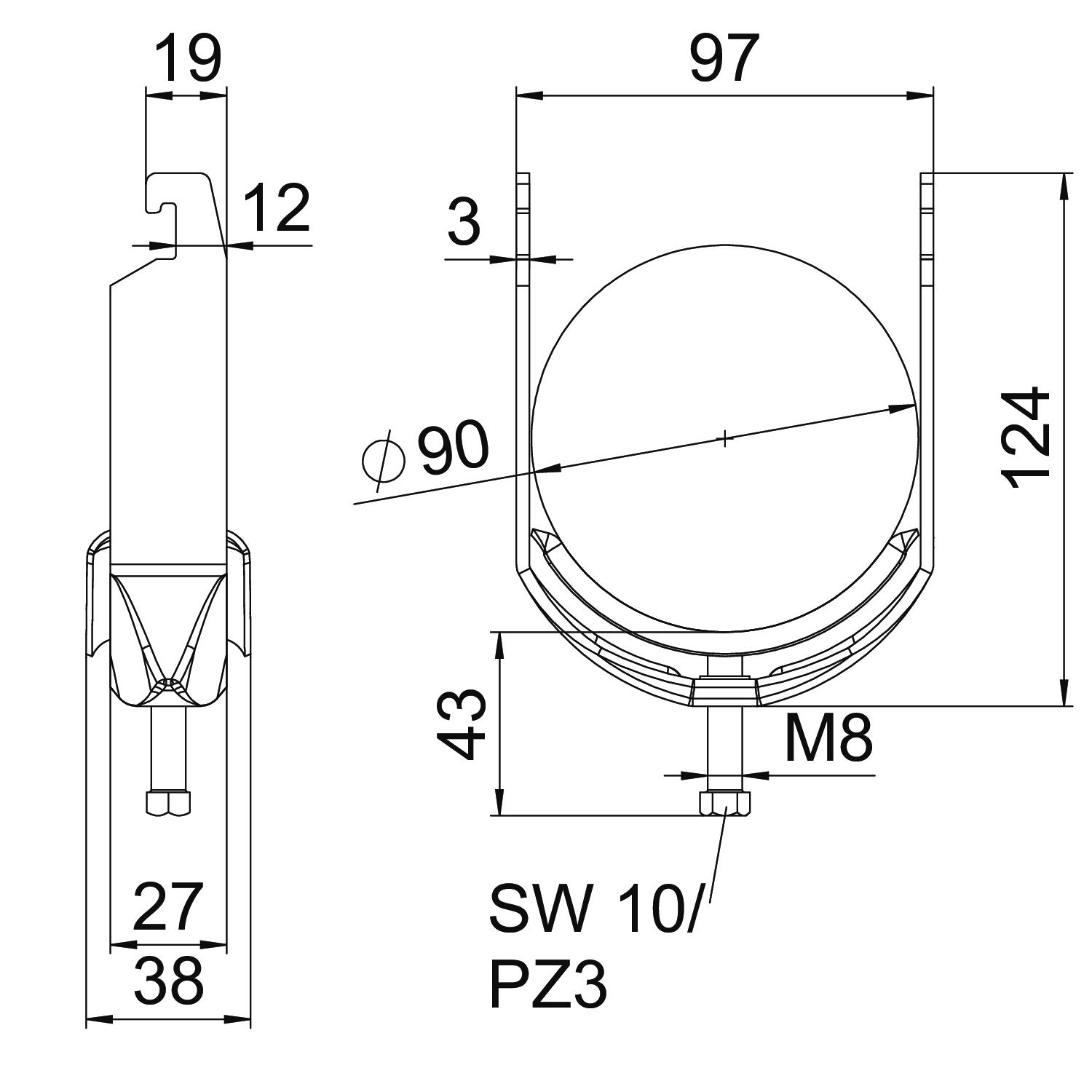 Altura 124 mm Com contraplaca não Com placa de plástico não Com placa metálica sim Comprimento 27 mm Comprimento exterior 38 mm Dimensão 82-90mm Espessura das chapas 3 mm Funktionsgaranti sim Intervalo de aperto D máx. 90 mm Intervalo de aperto D mín. 82 mm Largura 97 mm Largura de rasgo 10 mm Livre de halogéneos sim Material Aço Material adicional Aço Material da cuba Aço Máx. Binário de aperto 5 Nm Medida A 27 mm Medida B 97 mm Medida C 38 mm Medida G (mm) M8 Medida H 124 mm Medida L 43 mm Medida t 3 mm Número de cabos/tubos 1 para diâmetro de tubo máx. 90 mm para diâmetro de tubo mín. 82 mm para perfil com rasgo (com intervalo) máx. 22 mm para perfil com rasgo (com intervalo) mín. 18 mm Pegada de CO2 (GWP) do berço ao portão 0,7018 kg CO2e / 1 Peça Rosca M8 Superfície Galvanizado por imersão a quente após maquinação Superfície adicional galvanizado a quente por centrifugação Tipo de montagem Perfil - Todos os tipos