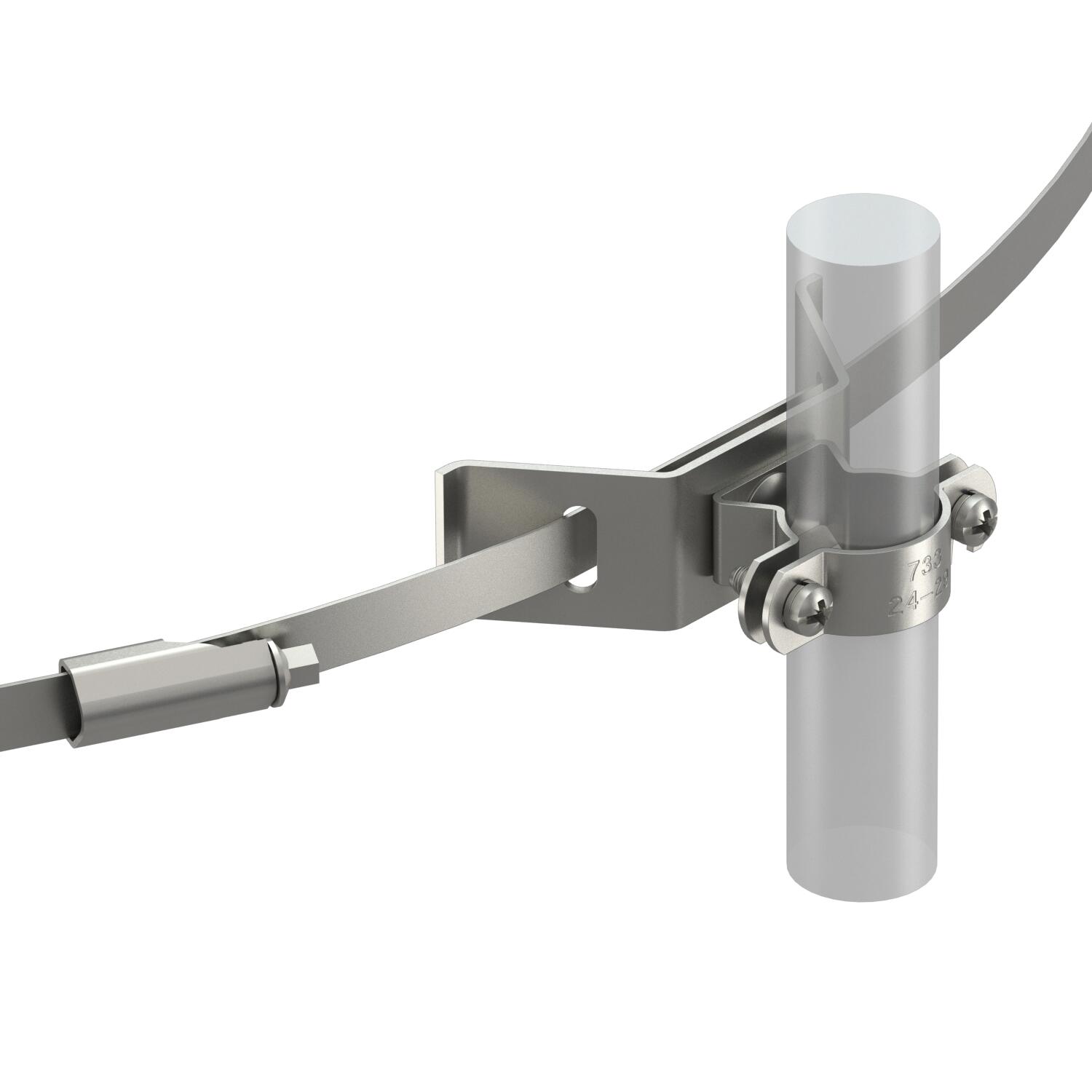 Descrição do produtoSuporte de cabos com tensor para cabo isCon®, para montagem em tubos com ø ≤ 600 mm. Inclui anilhas de mola para proteger o parafuso contra o afrouxamento.