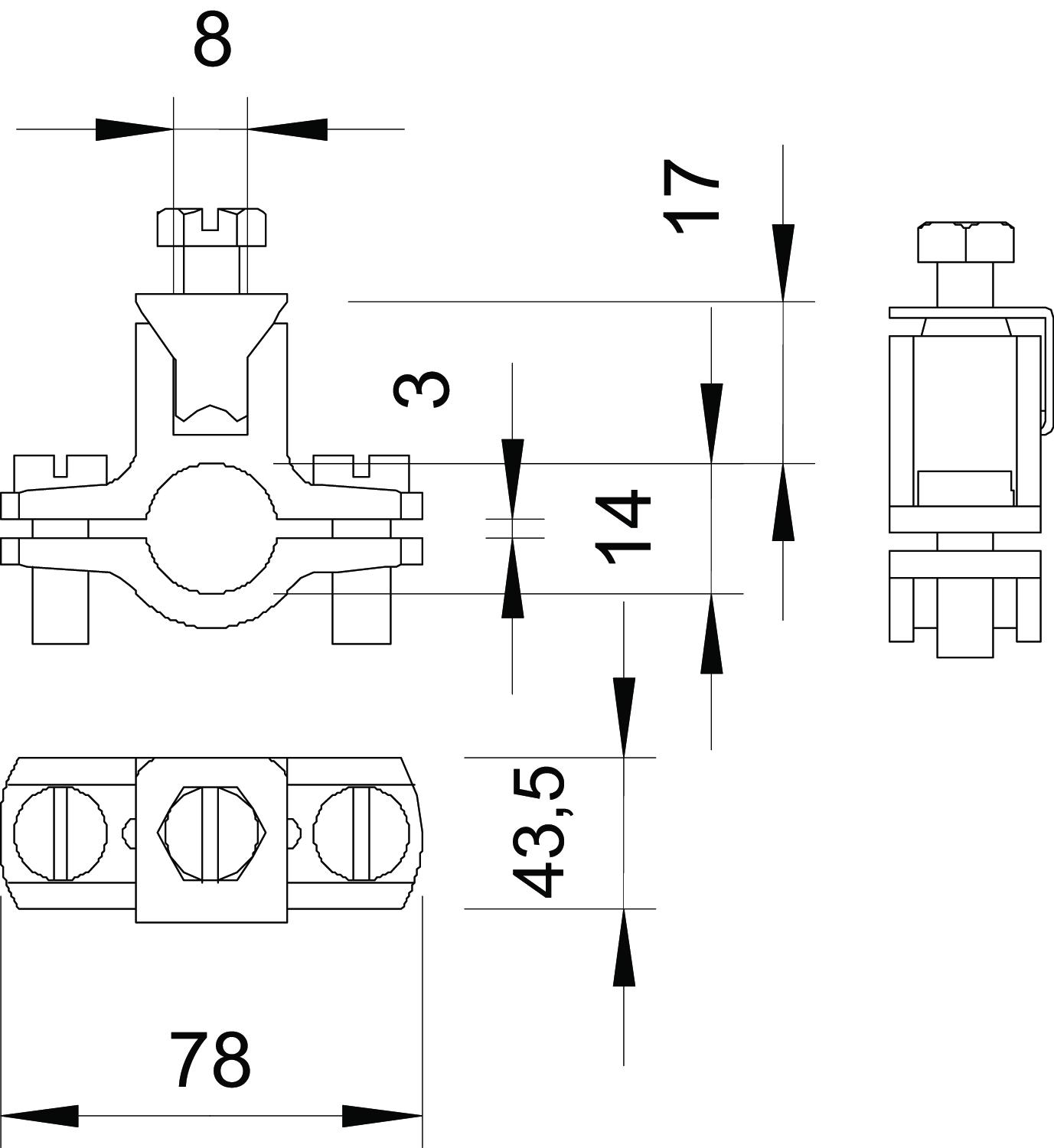 • com grampo de pressão imperdível, 2 parafusos cabeça cilíndrica M6 x 16 e 1 parafuso sextavado M6 x 16 em aço eletrozincado, parte superior e inferior da abraçadeira em zinco fundido sob pressão
