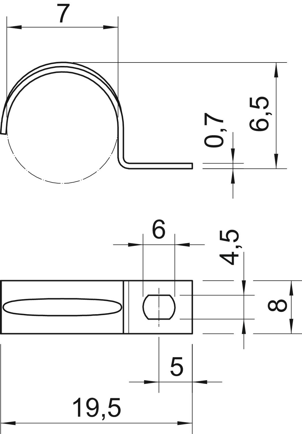 Altura 6,5 mm Apropriado para área de proteção contra incêndios não Comprimento 19,5 mm Diâmetro nominal 7 mm Dimensão 7mm Dimensão do furo 4,5 x 6 mm Distância à parede não Espessura do material 0,7 mm Largura 8 mm Livre de halogéneos sim Material Aço Medida A 5 mm Medida b 8 mm Medida D 7 mm Medida d 4,5 mm Medida e 6 mm Medida H 6,5 mm Medida L 19,5 mm Medida t 0,7 mm Número de cabos/tubos 1 para diâmetro 7 Pegada de CO2 (GWP) do berço ao portão 0,0038 kg CO2e / 1 Peça Resistente à radiação UV sim Revestimento plástico não Superfície eletrogalvanizado Tipo de fixação Orifício roscado Versão uma patilha - Todos os tipos