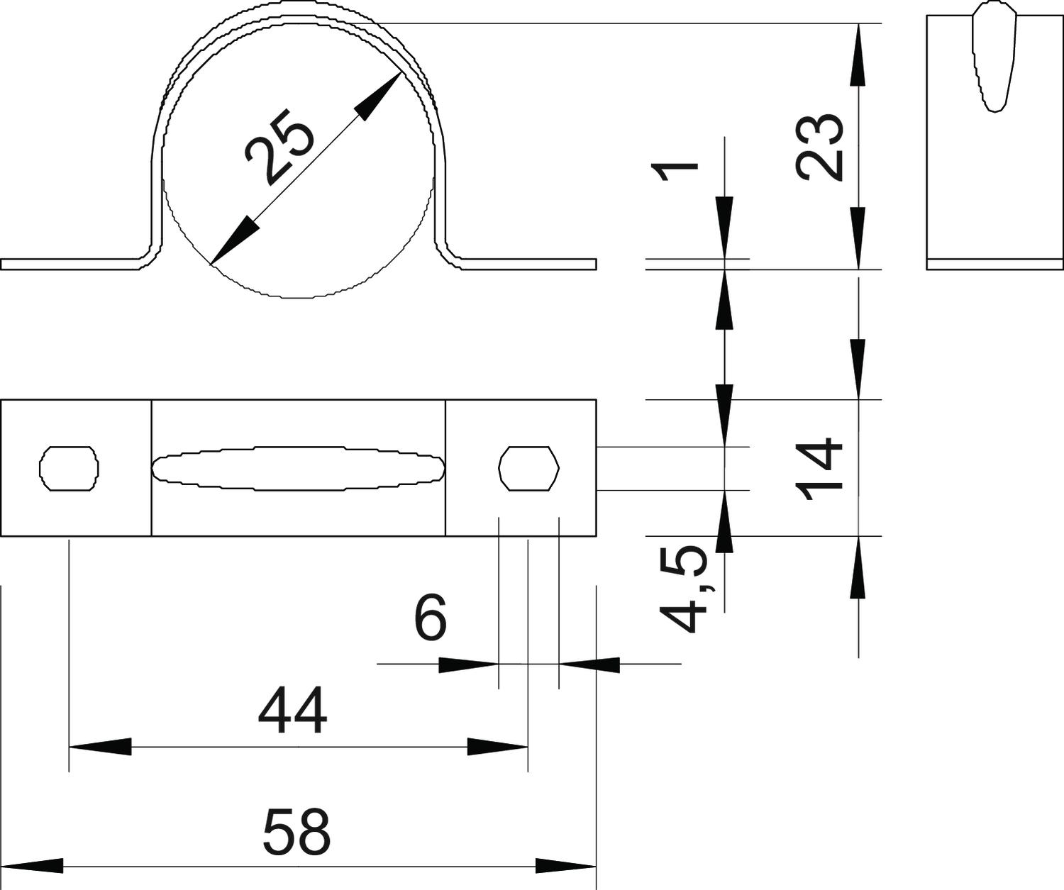 Altura 23 mm Apropriado para área de proteção contra incêndios não Comprimento 58 mm Diâmetro nominal 25 mm Dimensão 25mm Dimensão do furo 4,5 x 6 mm Distância à parede não Espessura do material 1 mm Intervalo de aperto D máx. 25 mm Intervalo de aperto D mín. 25 mm Largura 14 mm Livre de halogéneos sim Material Alumínio Medida A 58 mm Medida b 14 mm Medida B 44 mm Medida D 25 mm Medida d 4,5 mm Medida e 6 mm Medida H 23 mm Medida t 1 mm Número de cabos/tubos 1 para diâmetro 25 Pegada de CO2 (GWP) do berço ao portão 0,059 kg CO2e / 1 Peça Resistente à radiação UV sim Revestimento plástico não Tipo de fixação Orifício roscado Versão duas patilhas - Todos os tipos