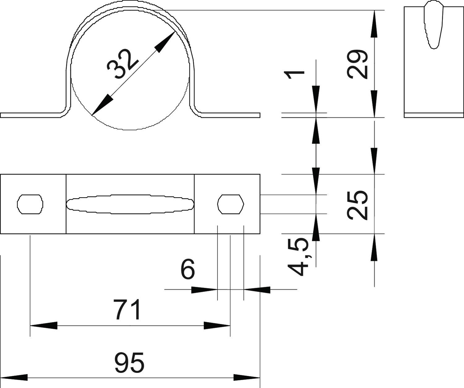 Altura 29 mm Apropriado para área de proteção contra incêndios não Comprimento 95 mm Diâmetro nominal 32 mm Dimensão 32mm Dimensão do furo 4,5 x 6 mm Distância à parede não Espessura do material 1 mm Intervalo de aperto D máx. 32 mm Intervalo de aperto D mín. 32 mm Largura 25 mm Livre de halogéneos sim Material Alumínio Medida A 95 mm Medida B 71 mm Medida b 25 mm Medida d 4,5 mm Medida D 32 mm Medida e 6 mm Medida H 29 mm Medida t 1 mm Número de cabos/tubos 1 para diâmetro 32 Pegada de CO2 (GWP) do berço ao portão 0,0724 kg CO2e / 1 Peça Resistente à radiação UV sim Revestimento plástico não Tipo de fixação Orifício roscado Versão duas patilhas - Todos os tipos