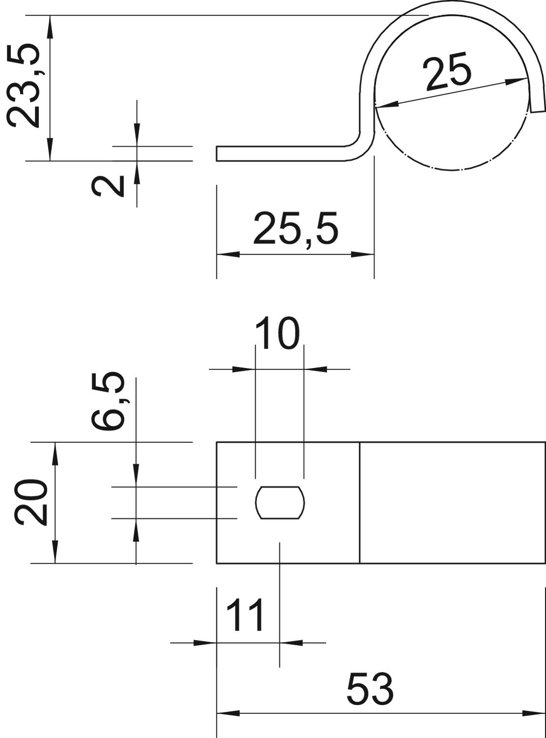 Altura 23,5 mm Apropriado para área de proteção contra incêndios não Comprimento 53 mm Diâmetro nominal 25 mm Dimensão 25mm Dimensão do furo 6,5 x 10 mm Distância à parede não Espessura do material 2 mm Largura 20 mm Livre de halogéneos sim Material Aço Medida A 11 mm Medida b 20 mm Medida D 25 mm Medida H 23,5 mm Medida L 25,5 mm Medida L1 53 mm Medida t 3 mm Número de cabos/tubos 1 para diâmetro 25 Pegada de CO2 (GWP) do berço ao portão 0,0735 kg CO2e / 1 Peça Resistente à radiação UV sim Revestimento plástico não Superfície Galvanizado por imersão a quente após maquinação Tamanho M25 Tipo de fixação Orifício roscado Versão uma patilha - Todos os tipos