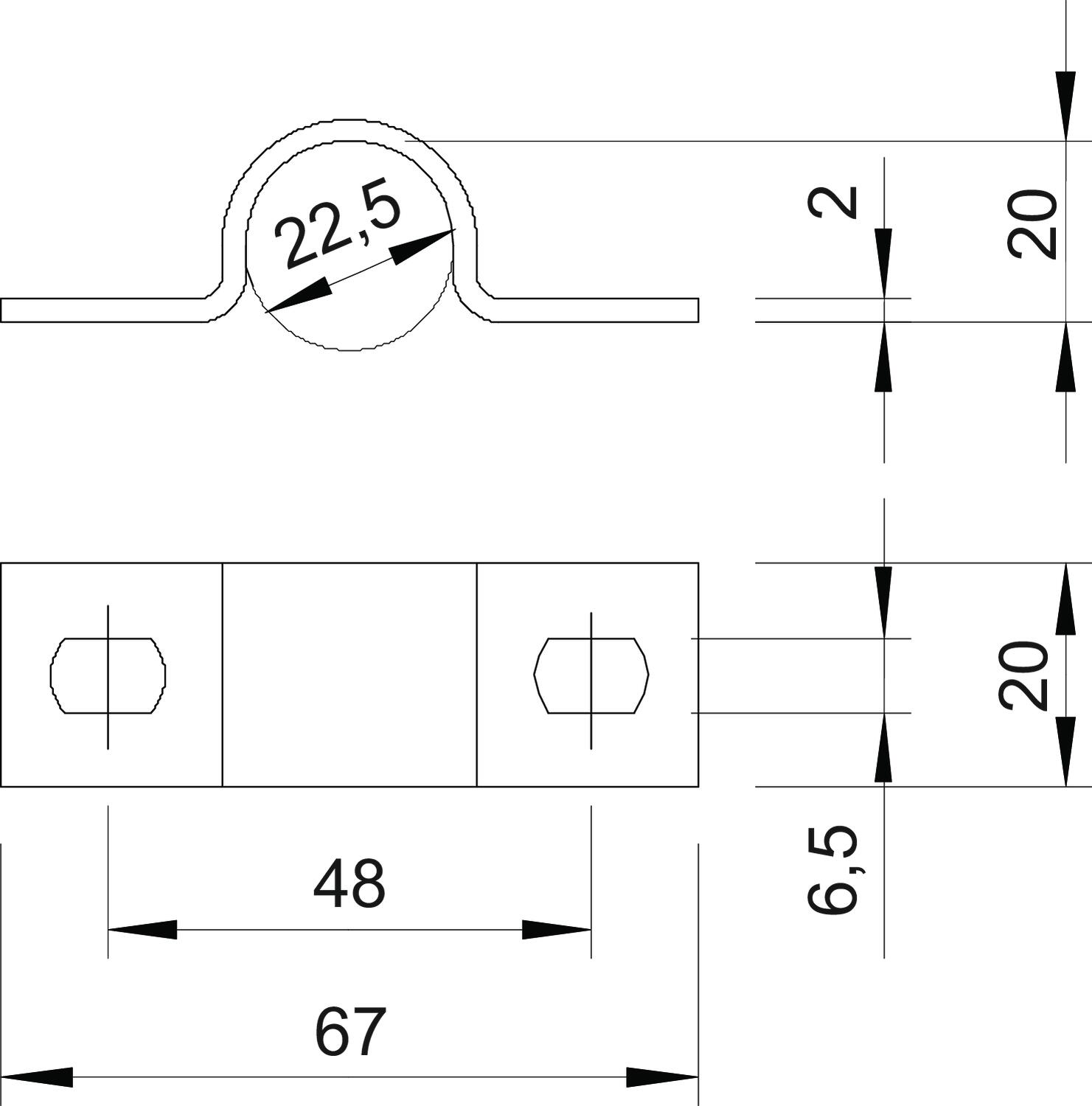 Altura 20 mm Apropriado para área de proteção contra incêndios não Comprimento 67 mm Diâmetro nominal 22,5 mm Dimensão 23mm Dimensão do furo 6,5 x 10 mm Distância à parede não Espessura do material 2 mm Largura 20 mm Livre de halogéneos sim Material Aço Medida A 67 mm Medida b 20 mm Medida B 48 mm Medida D 22,5 mm Medida d 6,5 mm Medida e 10 mm Medida H 20 mm Medida t 2 mm Número de cabos/tubos 1 para diâmetro 22,5 Pegada de CO2 (GWP) do berço ao portão 0,0667 kg CO2e / 1 Peça Resistente à radiação UV sim Revestimento plástico não Superfície Galvanizado por imersão a quente após maquinação Tipo de fixação Orifício roscado Versão duas patilhas - Todos os tipos