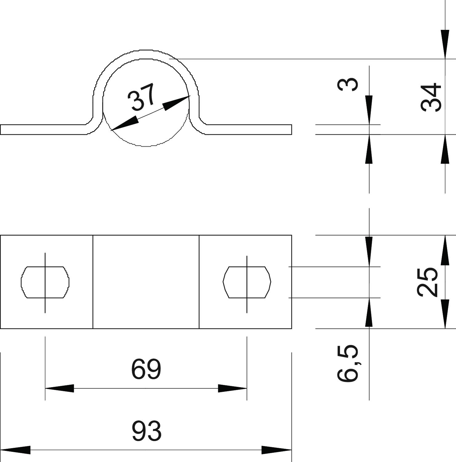 Altura 34 mm Apropriado para área de proteção contra incêndios não Comprimento 93 mm Diâmetro nominal 37 mm Dimensão 37mm Dimensão do furo 6,5 x 10 mm Distância à parede não Espessura do material 3 mm Largura 25 mm Livre de halogéneos sim Material Aço Medida A 93 mm Medida b 25 mm Medida B 69 mm Medida D 37 mm Medida d 6,5 mm Medida e 10 mm Medida H 34 mm Medida t 3 mm Número de cabos/tubos 1 para diâmetro 37 Pegada de CO2 (GWP) do berço ao portão 0,1837 kg CO2e / 1 Peça Resistente à radiação UV sim Revestimento plástico não Superfície Galvanizado por imersão a quente após maquinação Tipo de fixação Orifício roscado Versão duas patilhas - Todos os tipos