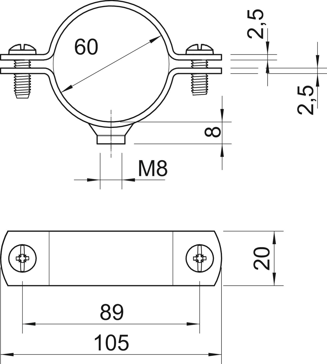 Apropriado para área de proteção contra incêndios não Comprimento 105 mm Dimensão 2" Dimensão do furo M8 mm Espessura do material 2,5 mm Intervalo de aperto D máx. 60 mm Intervalo de aperto D mín. 56 mm Largura 20 mm Livre de halogéneos não Material Aço Medida A 105 mm Medida B 89 mm Medida D 60 mm Medida d mín. 60 mm Medida t 2,5 mm Medida t1 (mm) 2,5 Medida x 4 mm para diâmetro 60 para diâmetro de tubo M63 Parafuso M6 x 18 Pegada de CO2 (GWP) do berço ao portão 0,2552 kg CO2e / 1 Peça Resistente à radiação UV sim Revestimento plástico não Rosca M8 Superfície Galvanizado por imersão a quente após maquinação Tamanho 2" Tipo de fixação Orifício roscado Versão fechadas - Todos os tipos
