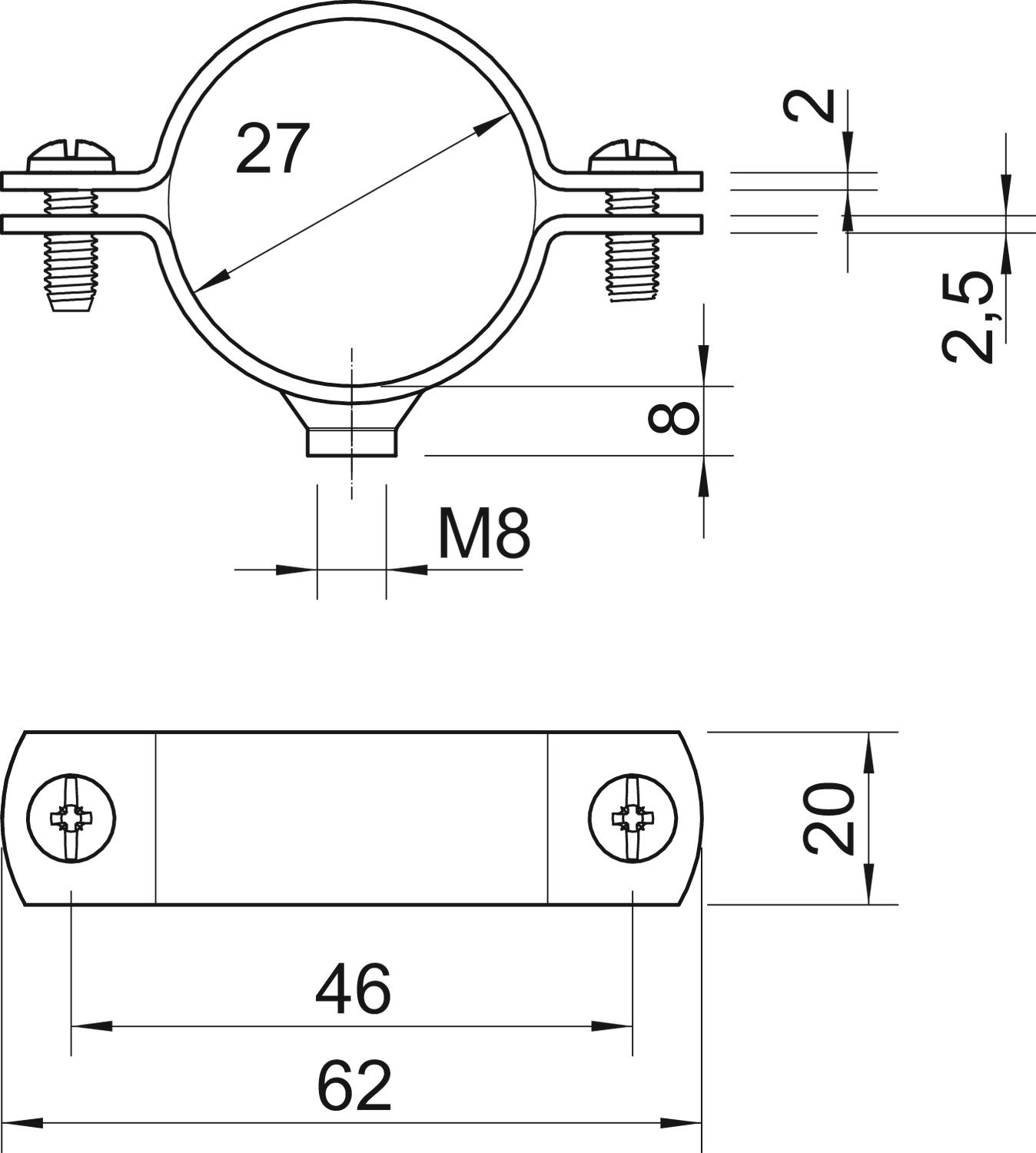 Apropriado para área de proteção contra incêndios não Comprimento 62 mm Dimensão 3/4" Dimensão do furo M8 mm Espessura do material 2 mm Intervalo de aperto D máx. 27 mm Intervalo de aperto D mín. 24,5 mm Largura 20 mm Livre de halogéneos não Material Aço Medida A 62 mm Medida B 46 mm Medida D 27 mm Medida d mín. 27 mm Medida t 2 mm Medida t1 (mm) 2,5 Medida x 2,5 mm para diâmetro 27 para diâmetro de tubo M25 Parafuso M6 x 16 Pegada de CO2 (GWP) do berço ao portão 0,1428 kg CO2e / 1 Peça Resistente à radiação UV sim Revestimento plástico não Rosca M8 Superfície Galvanizado por imersão a quente após maquinação Tamanho 3/4" Tipo de fixação Orifício roscado Versão fechadas - Todos os tipos