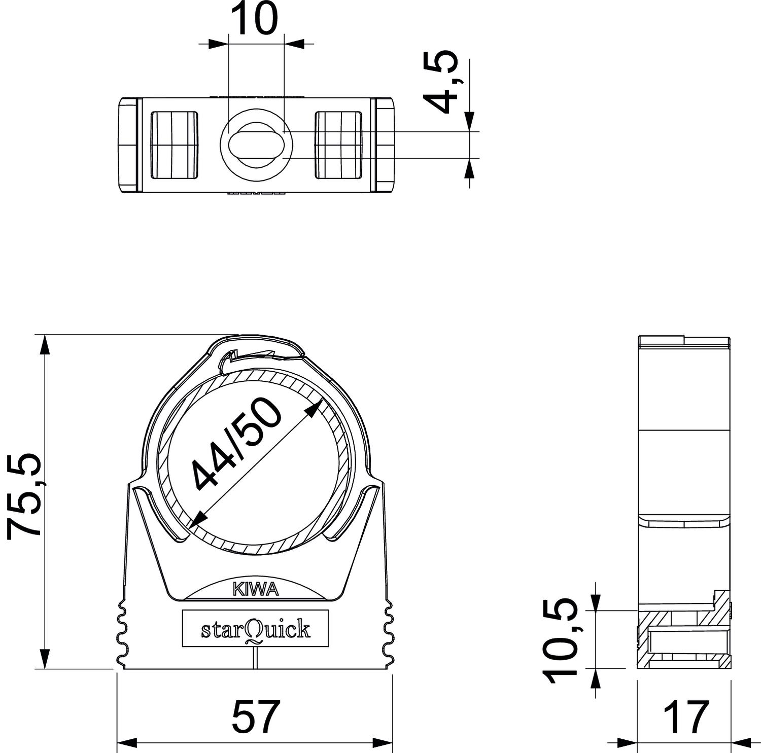 Agrupável sim Carga de rutura 1,2 kN Com depósito não Cor cinzento claro; RAL 7035 Dimensão 44-50mm Fechado sim Intervalo de aperto D máx. 50 mm Intervalo de aperto D mín. 44 mm Livre de halogéneos sim Material Poliamida Medida A 57 mm Medida B 17 mm Medida E 10 mm Medida F 4,5 mm Medida H 75,5 mm Medida h 10,5 mm Número de cabos/tubos 1 resistência ao fio incandescente conforme a VDE 0471/DIN 695 Parte 2-1, temperatura de ensaio 650 °C Resistente à radiação UV sim Tamanho nominal/Texto 45-50 Tipo de fixação Orifício roscado - Todos os tipos
