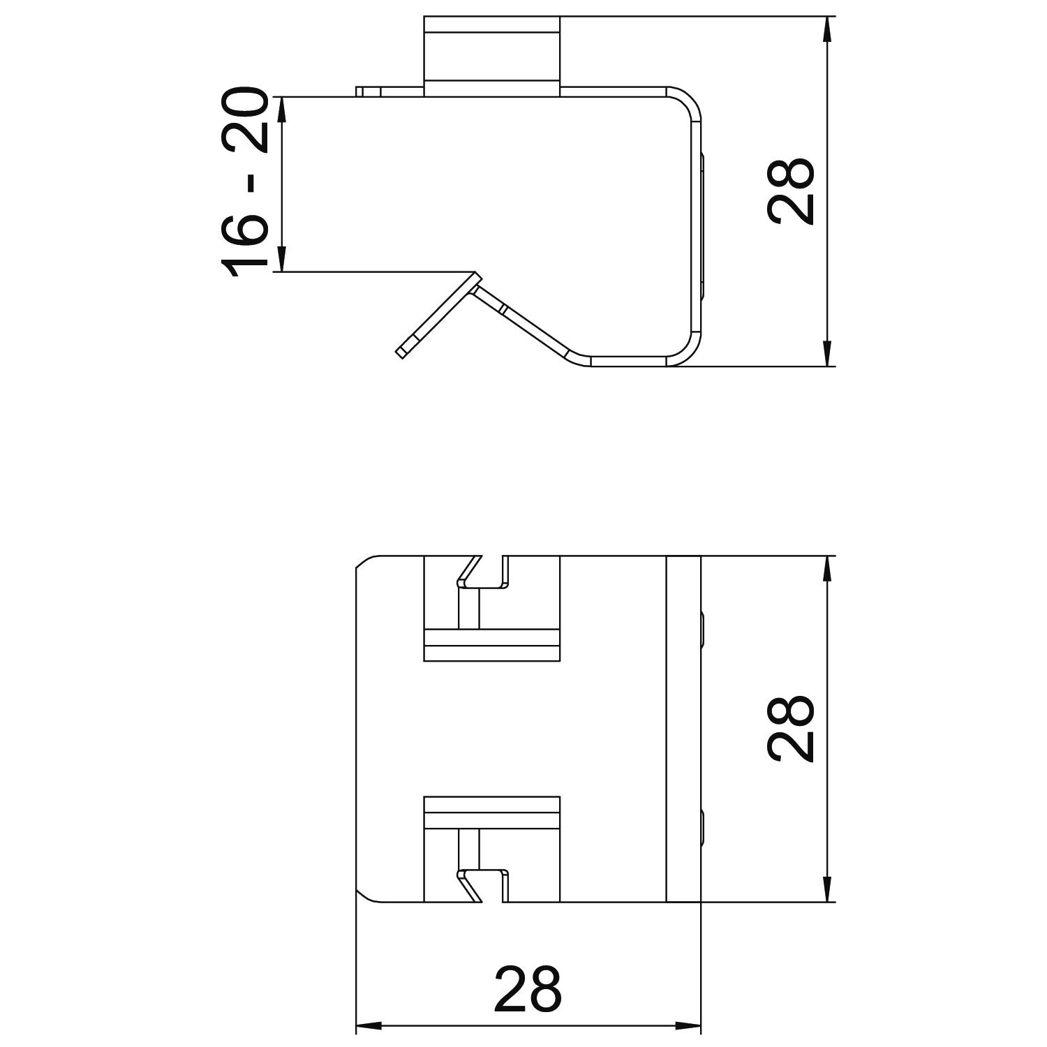 Altura 28 mm Comprimento 28 mm Cor zinco Dimensão 16-20mm Dobradiça não Dobradiça ajustável não Espessura do flange F máx. 20 mm Espessura do flange F mín. 16 mm Largura 28 mm Material Aço Medida L 14 mm Superfície Lamela de zinco Tipo de fixação apertar Tipo de ligação do componente Outros - Todos os tipos