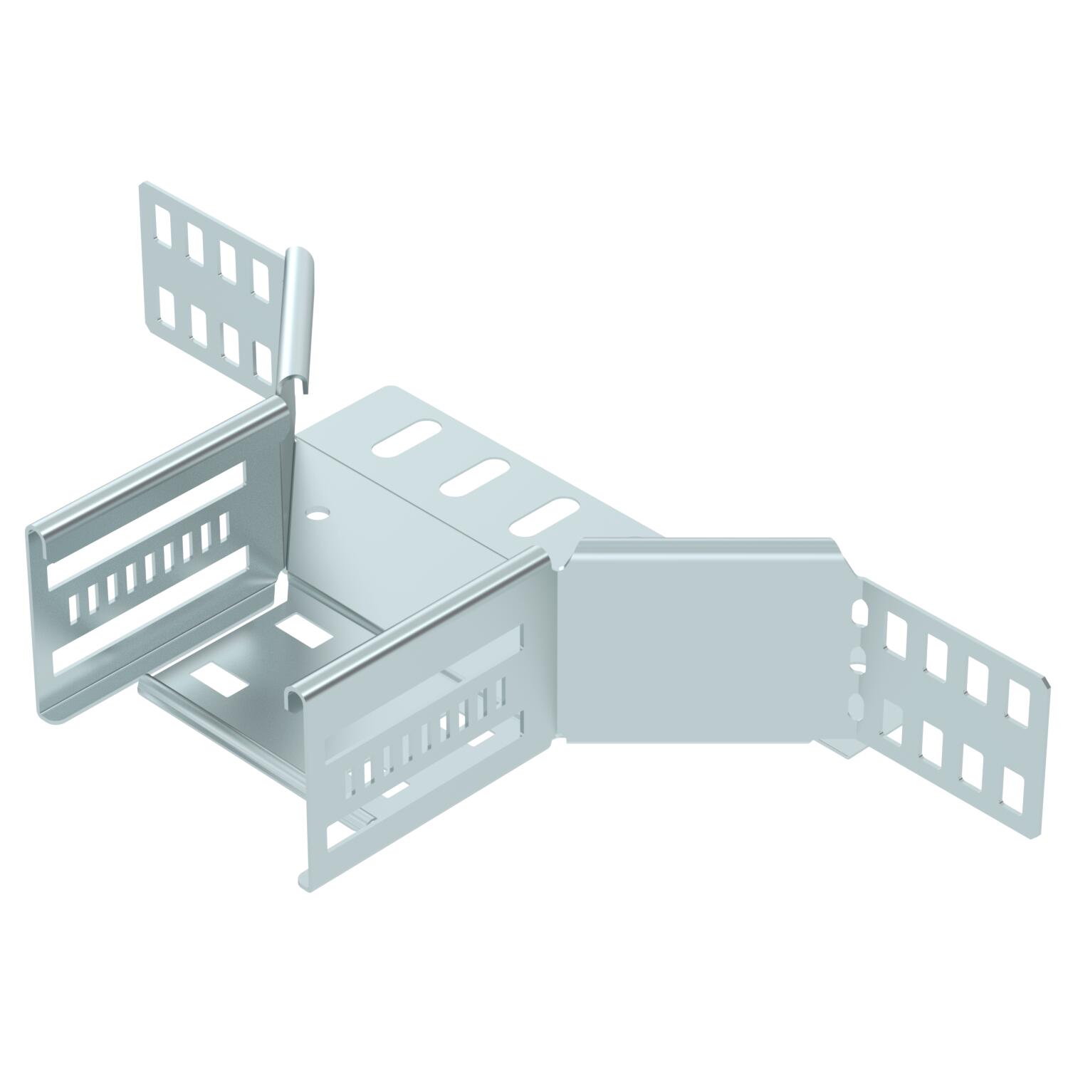 Add-on tee made from CO2-reduced steel for the creation of a horizontal branch or cross-over. Fitting for latchable and screwable cable trays, side height 60 mm. Screwless mounting with double clamps or screw connection with FRS truss-head screws and M6 combination nuts. Can be used in indoor areas. Fastening material must be ordered separately.