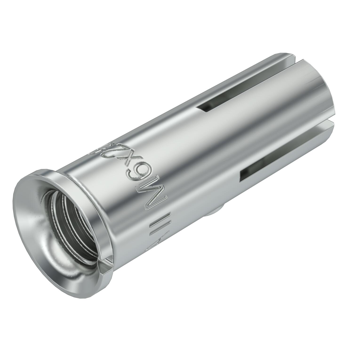 Descrição do produtoÂncora de fixação de fixação simples, com rosca interna em aço, para ancoragem de, por ex., sistemas de caminhos de cabos, consolas, estruturas de aço, etc. em betão não armado em interiores e exteriores. Para cravar com martelo. Com margem estampada para evitar que seja puxada para dentro do furo. Não enferruja e é altamente resistente à corrosão. A bucha de fixação é tensionada contra a parede do furo quando o pino interno é introduzido, por ex., com a ferramenta de fixação manual EHS M. Proteção antifogo testada, classe de resistência ao fogo R 120 conforme a Certificação técnica europeia ETA-07/0135 para betão.
