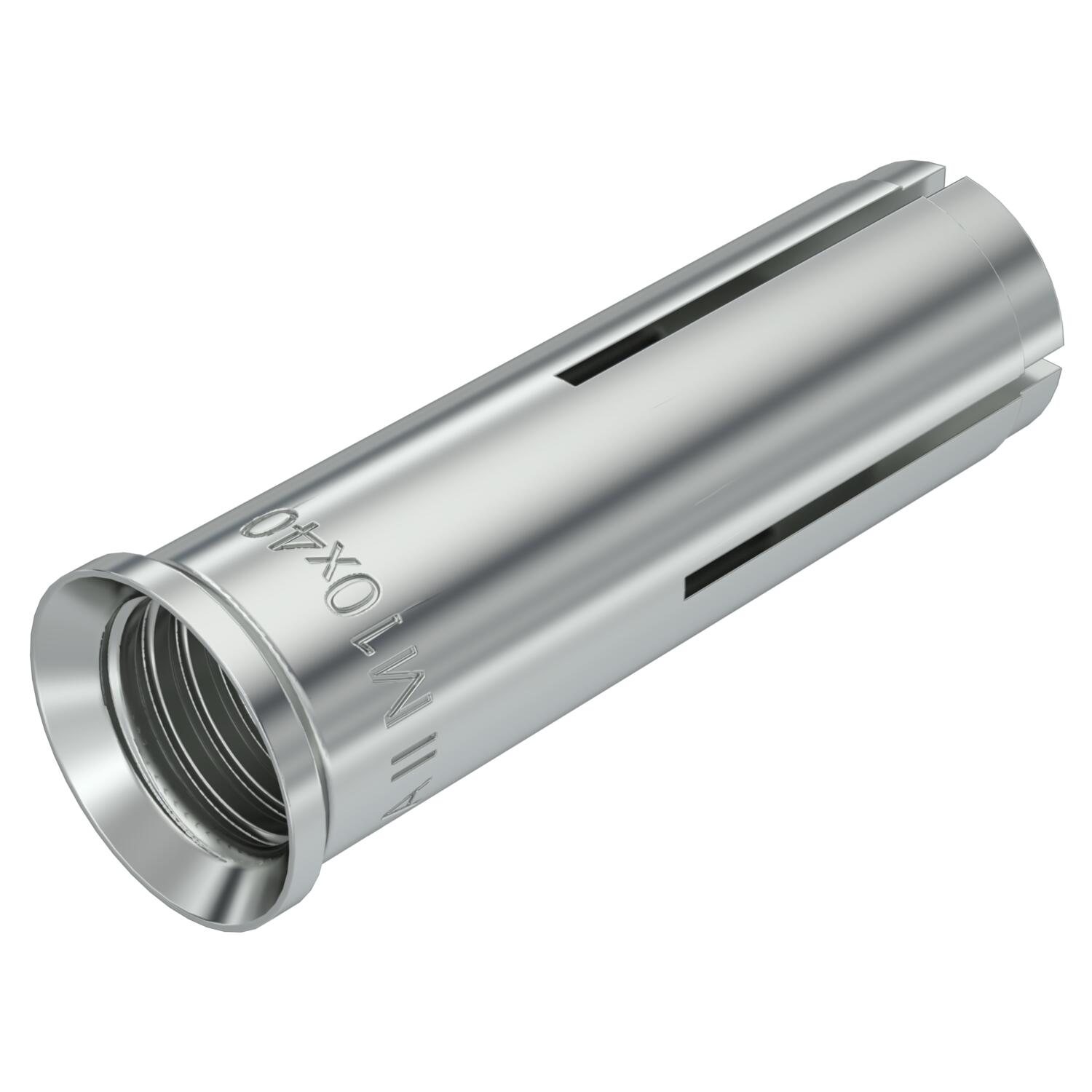 Descrição do produtoÂncora de fixação de fixação simples, com rosca interna em aço, para ancoragem de, por ex., sistemas de caminhos de cabos, consolas, estruturas de aço, etc. em betão não armado em interiores e exteriores. Para cravar com martelo. Com margem estampada para evitar que seja puxada para dentro do furo. Não enferruja e é altamente resistente à corrosão. A bucha de fixação é tensionada contra a parede do furo quando o pino interno é introduzido, por ex., com a ferramenta de fixação manual EHS M. Proteção antifogo testada, classe de resistência ao fogo R 120 conforme a Certificação técnica europeia ETA-07/0135 para betão.
