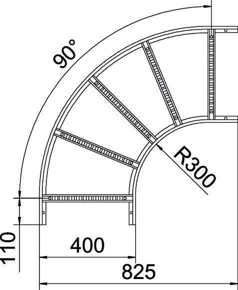 Descrição do produtoÂngulo 90º horizontal com degraus soldados para todos os caminhos de cabos tipo escada com altura lateral de 110 mm.