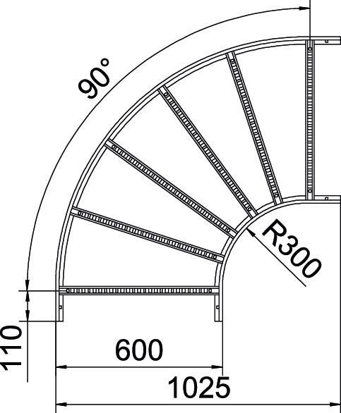 Descrição do produtoÂngulo 90º horizontal com degraus soldados para todos os caminhos de cabos tipo escada com altura lateral de 110 mm.