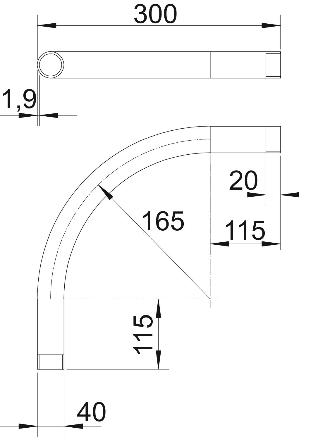 Ângulo do curva 90 ° Com escotilha de inspeção e tampa não Com manga sim Dimensão M40x1,5 Duas peças não Flexível não Gama de temperaturas de aplicação máx. 250 °C Gama de temperaturas de aplicação mín. -45 °C Livre de halogéneos não Material Alumínio Medida A 115 mm Medida B 300 mm Medida D 40 mm Medida l 20 mm Medida M (mm) M40 Medida R 165 mm Medida t 1,9 mm para diâmetro nominal de tubo 40 mm Rosca M40x1,5 Superfície escovada não Superfície polida não Versão Rosca - Todos os tipos