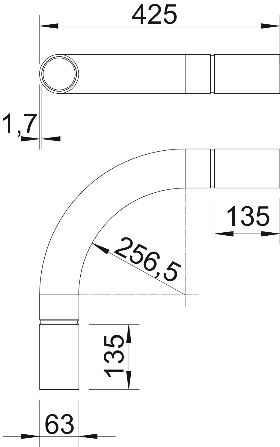 Ângulo do curva 90 ° Com escotilha de inspeção e tampa não Com manga sim Dimensão Ø63mm Duas peças não Flexível não Gama de temperaturas de aplicação máx. 250 °C Gama de temperaturas de aplicação mín. -45 °C Livre de halogéneos não Material Alumínio Medida A 135 mm Medida B 425 mm Medida D 63 mm Medida l 70 mm Medida M (mm) M63 Medida R 225 mm Medida t 1,7 mm para diâmetro nominal de tubo 63 mm Superfície escovada não Superfície polida não Versão Encaixe - Todos os tipos