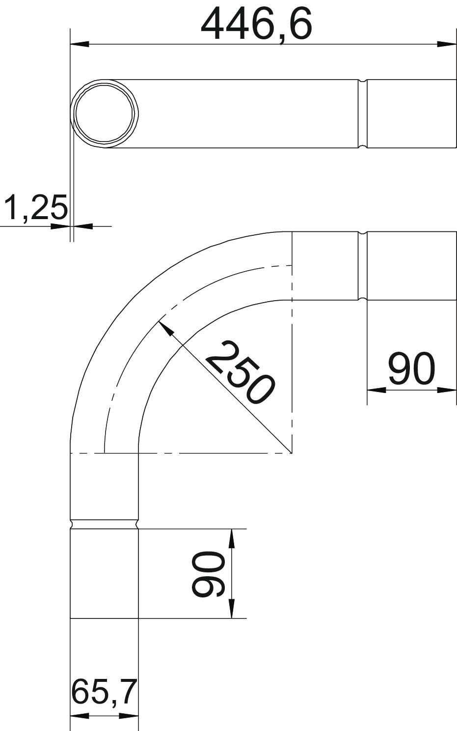 Ângulo do curva 90 ° Com escotilha de inspeção e tampa não Com manga sim Dimensão Ø63mm Duas peças não Flexível não Gama de temperaturas de aplicação máx. 400 °C Gama de temperaturas de aplicação mín. -45 °C Livre de halogéneos não Material Aço inoxidável 1.4571 Medida A 90 mm Medida B 446,6 mm Medida D 65,7 mm Medida d 63,2 mm Medida l 50 mm Medida M (mm) M63 Medida R 250 mm Medida t 1,25 mm para diâmetro nominal de tubo 63 mm Pegada de CO2 (GWP) do berço ao portão 7,0795 kg CO2e / 1 Peça Superfície brilhante, pós-tratamento Superfície escovada sim Superfície polida não Versão Encaixe - Todos os tipos