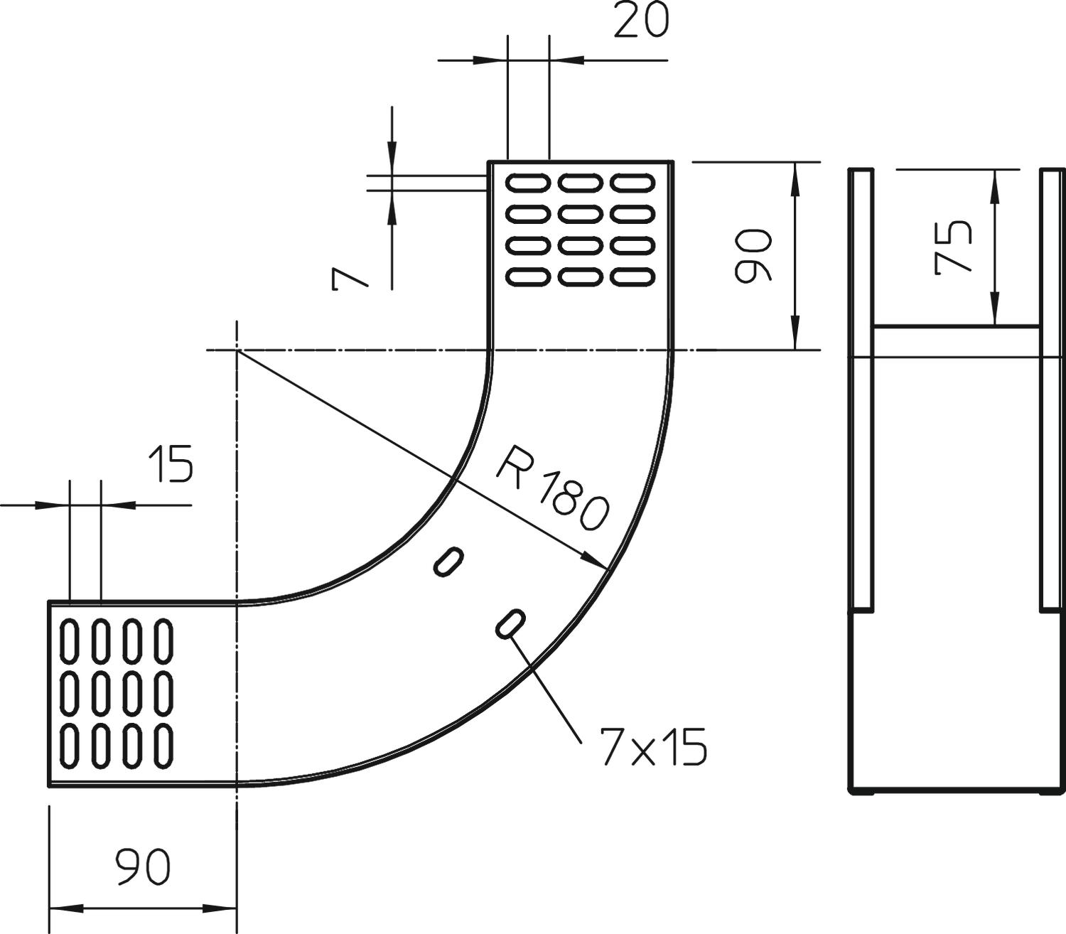 Descrição do produtoÂngulo vertical de 90° na versão ascendente para todos os tipos de caminhos de cabos em chapa com 85 mm de altura lateral.