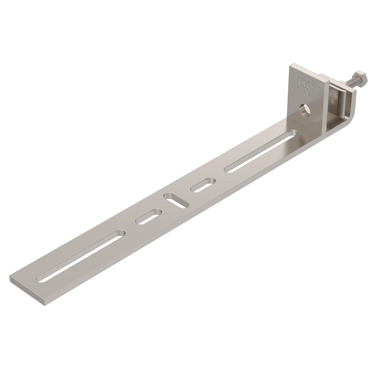 Descrição do produtoBeam clamp for mounting light components on vertical steel beams. Suitable, for example, for mesh cable trays and cable trays to 300 mm width or clips. The direction of the cable support system attached to the beam clamp is vertical.