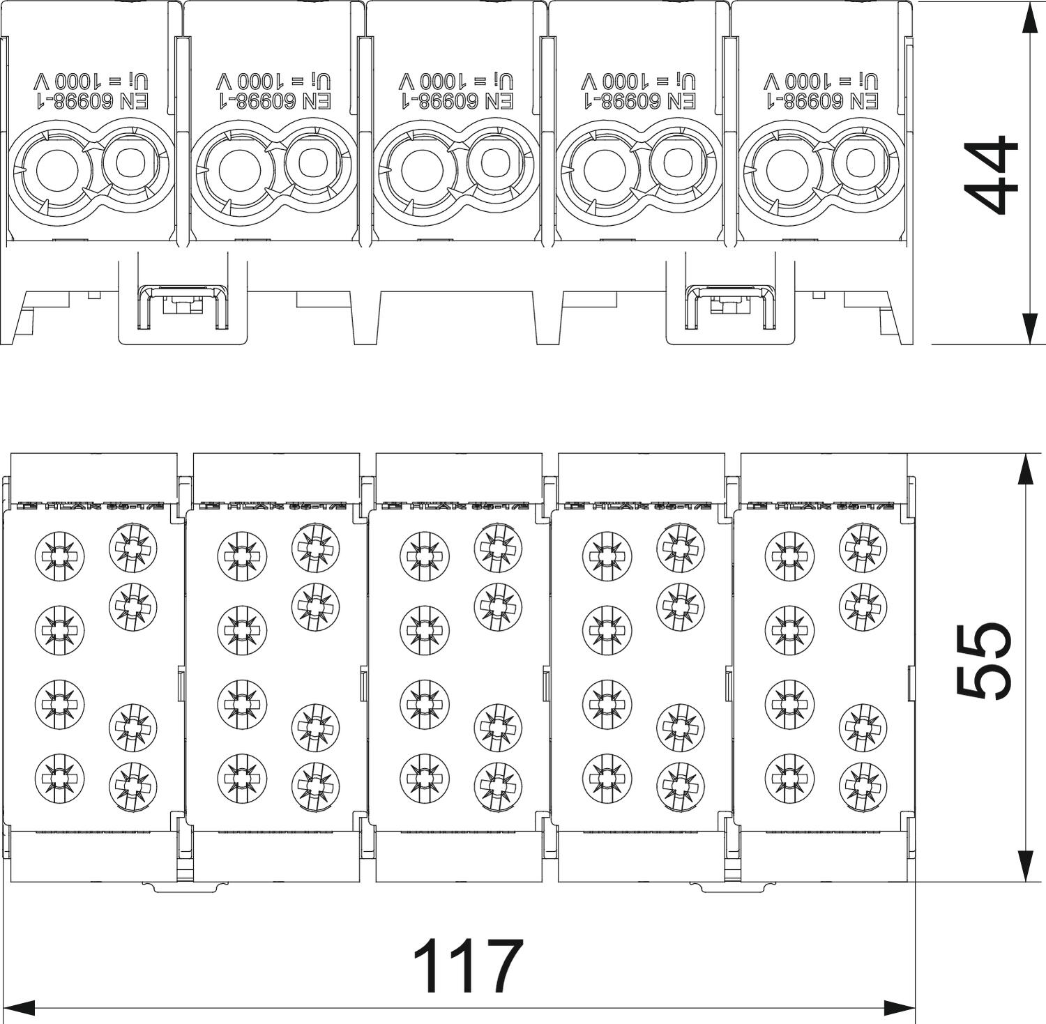 Descrição do produtoTerminal de derivação da linha principal de 5 polos, secções transversais de conexão do condutor de 2 x 35 mm² + 2 x 25 mm² por polo. Com 2 parafusos por ponto de aperto para pressão de contacto segura. Fixação rápida de alta resistência em chapa de aço galvanizada para fácil montagem em calhas DIN.