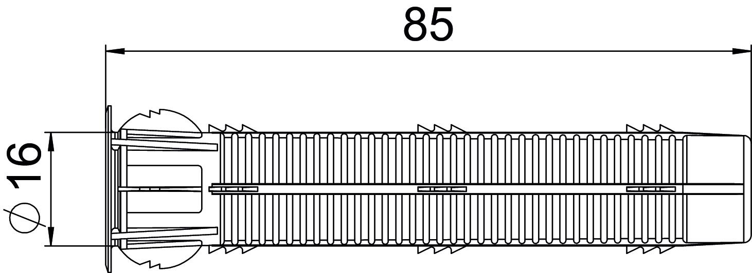 A bucha perfurada de plástico VM-SH 16x85 é montada com parafuso de ancoragem VMU-A 10x130 e VMU-A 10x150 ou perno roscado fêmea VMU-IG M6x80.