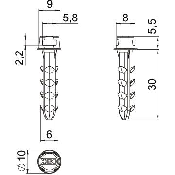 Descrição do produtoBucha rápida Delta-Push® para montagem em instalações elétricas. Adequada para betão, tijolo sílico-calcário, tijolo maciço, tijolo perfurado ou betão celular. Montagem sem ferramentas, pressionando num furo na parede ou teto. Sem parafusos. Com encaixe para abraçadeiras de até 4,8 mm de largura e 2 mm de altura para fixação de cabos e tubos.