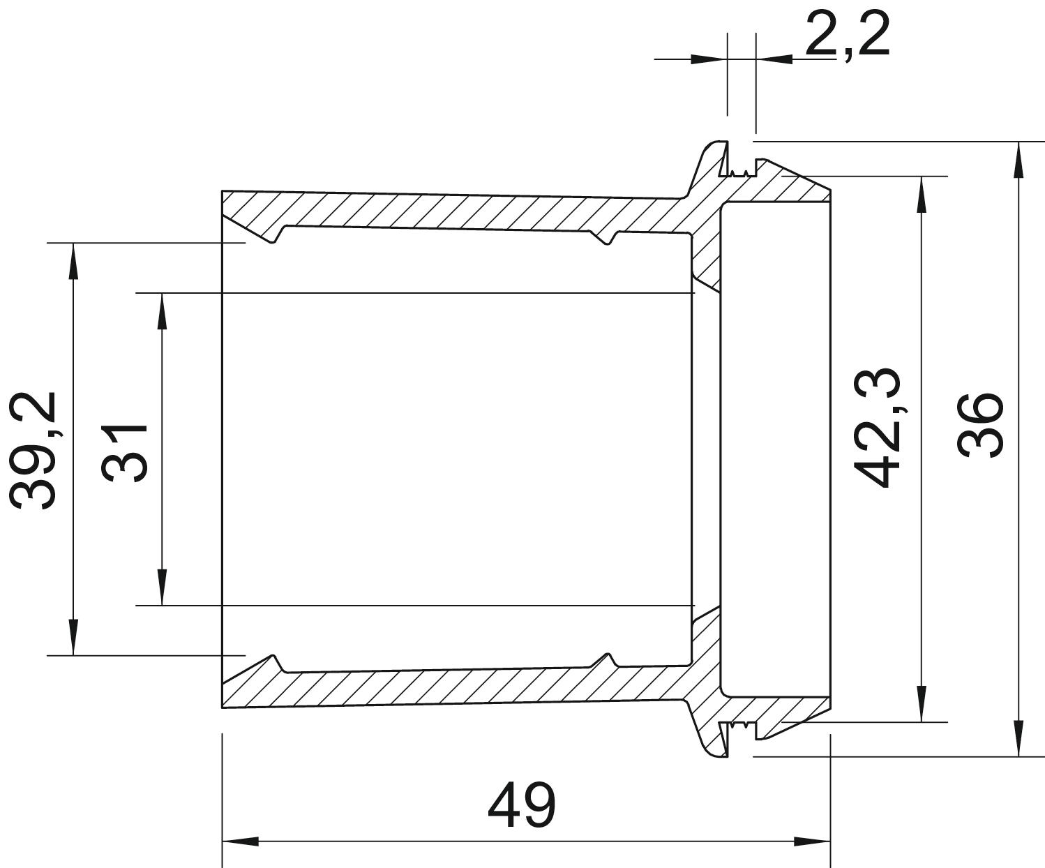Cor cinzento claro; RAL 7035 Diâmetro nominal 40 mm Dimensão Ø40/32-40 Dimension D4 39,2 mm Grau de proteção IP55 Livre de halogéneos sim Material Elastómero termoplástico Medida A 2,2 mm Medida D1 46 mm Medida D2 42,3 mm Medida D3 31 mm Medida L 49 mm para diâmetro máx. 40 mm para diâmetro mín. 32 mm para espessura máx. da parede 2,2 para espessura mín. da parede 2,2 Pegada de CO2 (GWP) do berço ao portão 0,0517 kg CO2e / 1 Peça Tamanho M40 Versão aberto - Todos os tipos