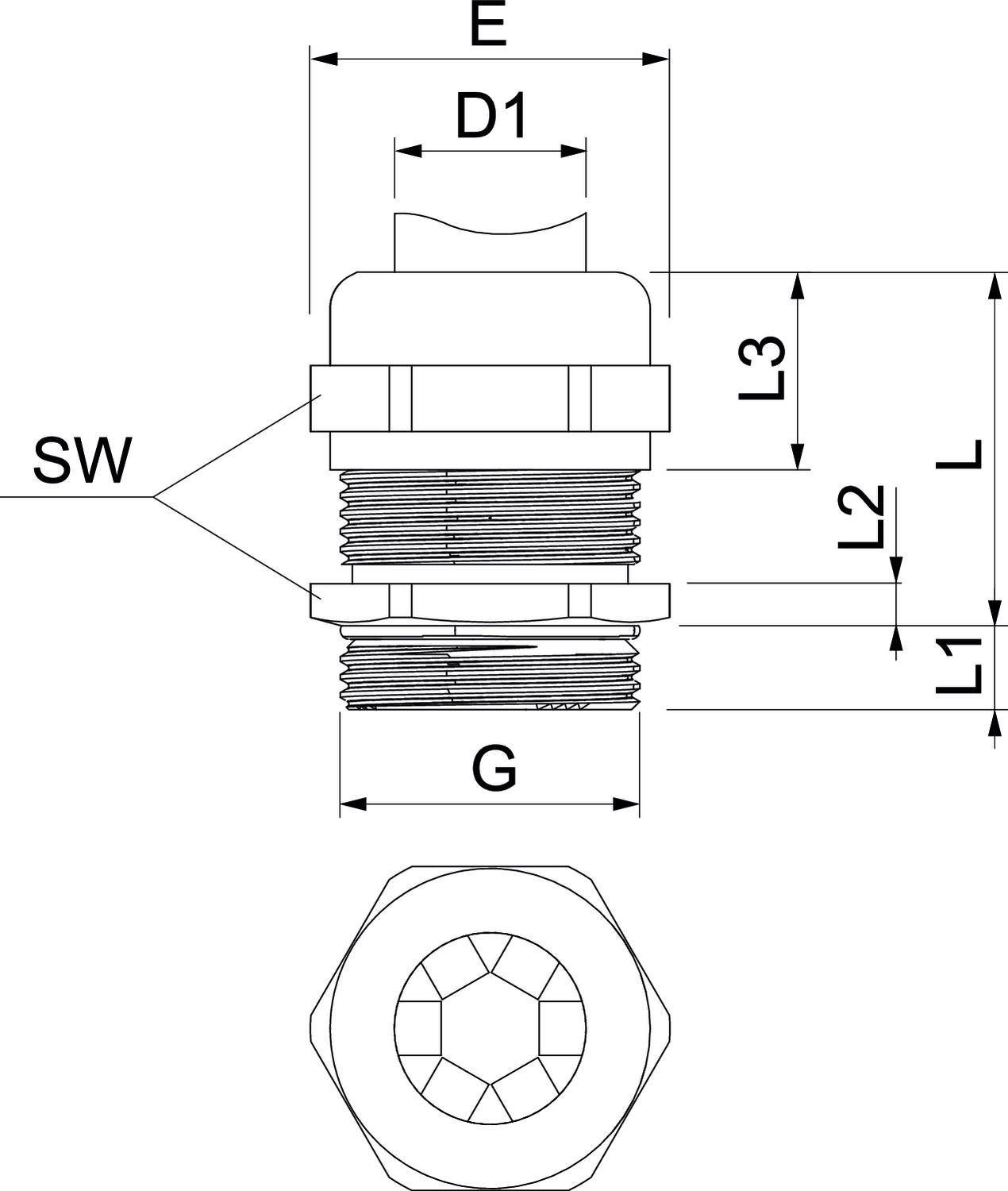 Altura 33,5 mm Área de vedação D mín. 9 mm Bucim para cabos planos não Capacidade de vedação D máx. 13 mm Com porca não Comprimento 22 mm Comprimento da rosca 6 mm Dimensão M20 Gama de temperaturas de aplicação máx. 100 °C Gama de temperaturas de aplicação mín. -20 °C Grau de proteção IP68 Largura 24 mm Largura da chave 22 Livre de halogéneos não Material Latão Medida D1 9 mm Medida E 24 mm Medida G M20x1,5 mm Medida L 27,5 mm Medida L1 6 mm Medida L2 3,5 mm Medida L3 13,3 mm Para zonas potencialmente explosivas sem Passa cabos múltiplo não Pegada de CO2 (GWP) do berço ao portão 0,0922 kg CO2e / 1 Peça Possibilidade de alívio de tensão sim Proteção contra flexão não Reforçado a fibra de vidro não Resistente não Rosca M20 x 1,5 Superfície niquelado Tipo de vedação Anel de vedação Versão reta - Todos os tipos