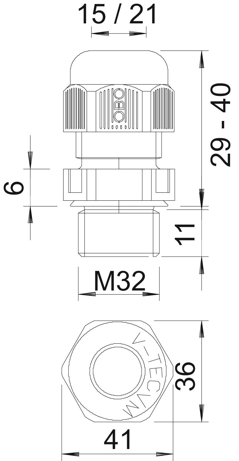 Área de vedação D mín. 15 mm Binário instável 7,5 Nm Bucim para cabos planos não Bucim separável não Capacidade de vedação D máx. 21 mm Com porca não Comprimento da rosca 11 mm Cor cinzento prateado; RAL 7001 Dimensão M32 Gama de temperaturas de aplicação máx. 65 °C Gama de temperaturas de aplicação mín. -20 °C Grau de proteção IP68 Largura da chave 36 Livre de halogéneos sim Material Poliamida Medida E 41 mm Medida L máx. 40 mm Medida L mín. 29 mm Medida L1 11 mm Medida L2 6 mm para zona Ex com gás sem para zona Ex com poeira sem Para zonas potencialmente explosivas sem Passa cabos múltiplo não Passo de rosca 1,5 mm Pegada de CO2 (GWP) do berço ao portão 0,1021 kg CO2e / 1 Peça Possibilidade de alívio de tensão sim Potegido contra explosões não Proteção contra flexão não Reforçado a fibra de vidro não resistência ao fio incandescente conforme a VDE 0471/DIN 695 Parte 2-1, temperatura de ensaio 650 °C Resistente não Rosca M32 x 1,5 Sextavado Largura entre cantos 41 mm Tamanho nominal da rosca 32 Tipo de rosca métrico Tipo de vedação Anel de vedação Versão reta - Todos os tipos
