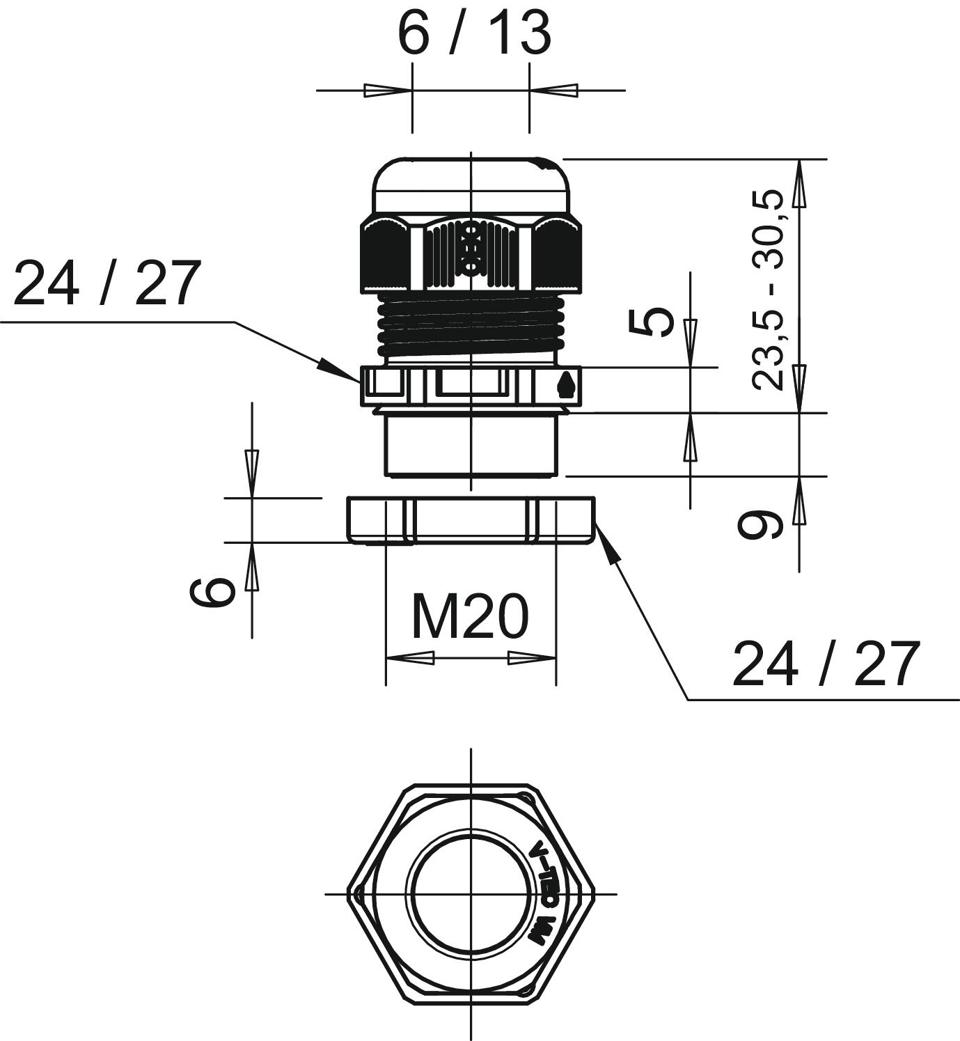 Área de vedação D mín. 6 mm Binário instável 3,8 Nm Bucim para cabos planos não Bucim separável não Capacidade de vedação D máx. 13 mm Com porca não Comprimento da rosca 9 mm Cor cinzento claro; RAL 7035 Dimensão M20 Gama de temperaturas de aplicação máx. 65 °C Gama de temperaturas de aplicação mín. -20 °C Grau de proteção IP68 Largura da chave 1 24 mm Largura da chave 2 24 mm Livre de halogéneos sim Material Poliamida Medida E1 (mm) 27 mm Medida E2 27 mm Medida L máx. 30,5 mm Medida L mín. 23,5 mm Medida L1 9 mm Medida L2 5 mm Medida L3 6 mm para zona Ex com gás sem para zona Ex com poeira sem Para zonas potencialmente explosivas sem Passa cabos múltiplo não Passo de rosca 1,5 mm Pegada de CO2 (GWP) do berço ao portão 0,0503 kg CO2e / 1 Peça Possibilidade de alívio de tensão sim Potegido contra explosões não Proteção contra flexão não Reforçado a fibra de vidro não resistência ao fio incandescente conforme a VDE 0471/DIN 695 Parte 2-1, temperatura de ensaio 650 °C Resistente não Rosca M20 x 1,5 Tamanho nominal da rosca 20 Tipo de rosca métrico Tipo de vedação Anel de vedação Versão reta - Todos os tipos