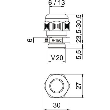 Área de vedação D mín. 7 mm Bucim para cabos planos não Bucim separável não Capacidade de vedação D máx. 14 mm Com porca não Comprimento da rosca 7 mm Cor cinzento claro; RAL 7035 Dimensão M20 Gama de temperaturas de aplicação máx. 65 °C Gama de temperaturas de aplicação mín. -20 °C Grau de proteção IP68 Largura da chave 27 Livre de halogéneos sim Material Poliamida Medida L máx. 33 mm Medida L mín. 25 mm Medida L1 7 mm Medida L2 6 mm Medida L3 19 mm para zona Ex com gás sem para zona Ex com poeira sem Para zonas potencialmente explosivas sem Passa cabos múltiplo não Passo de rosca 1,5 mm Pegada de CO2 (GWP) do berço ao portão 0,0658 kg CO2e / 1 Peça Possibilidade de alívio de tensão sim Potegido contra explosões não Proteção contra flexão não Reforçado a fibra de vidro não resistência ao fio incandescente conforme a VDE 0471/DIN 695 Parte 2-1, temperatura de ensaio 650 °C Resistente não Rosca M20 x 1,5 Sextavado Largura entre cantos 27 mm Tamanho nominal da rosca 20 Tipo de rosca métrico Tipo de vedação Anel de vedação Versão reta - Todos os tipos