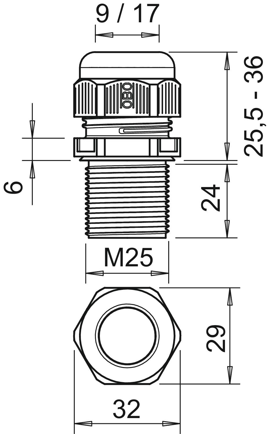 Área de vedação D mín. 9 mm Binário instável 5 Nm Bucim para cabos planos não Bucim separável não Capacidade de vedação D máx. 17 mm Com porca não Comprimento da rosca 24 mm Cor Preto Dimensão M25 Gama de temperaturas de aplicação máx. 65 °C Gama de temperaturas de aplicação mín. -20 °C Grau de proteção IP68 Largura da chave 29 Livre de halogéneos sim Material Poliamida Medida E 32 mm Medida L máx. 36 mm Medida L mín. 25,5 mm Medida L1 24 mm Medida L2 6 mm para zona Ex com gás sem para zona Ex com poeira sem Para zonas potencialmente explosivas sem Passa cabos múltiplo não Passo de rosca 1,8 mm Pegada de CO2 (GWP) do berço ao portão 0,0763 kg CO2e / 1 Peça Possibilidade de alívio de tensão sim Potegido contra explosões não Proteção contra flexão não Reforçado a fibra de vidro não resistência ao fio incandescente conforme a VDE 0471/DIN 695 Parte 2-1, temperatura de ensaio 650 °C Resistente não Rosca M25 x 1,5 Sextavado Largura entre cantos 32 mm Tamanho nominal da rosca 25 Tipo de rosca métrico Tipo de vedação Anel de vedação Versão reta - Todos os tipos