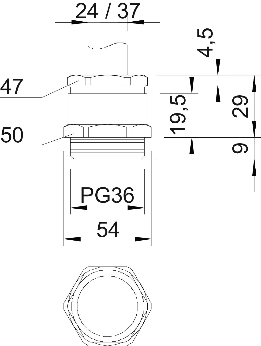 Descrição do produtoBucim com peça intermédia sextavada, modelo C4 conforme a DIN 46320, com rosca PG conforme a DIN 40430.